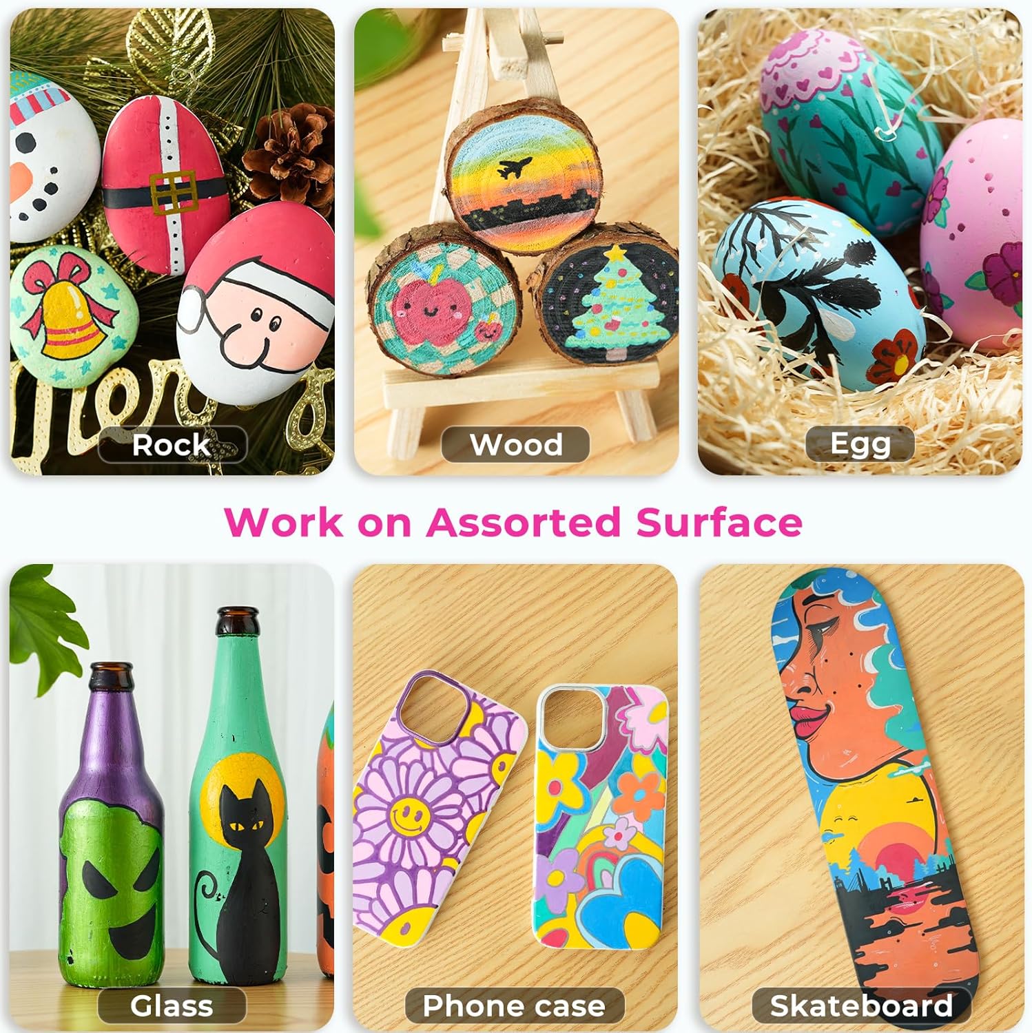 - WORK ON ASSORTED SURFACES: Let your imagination run wild with the Ohuhu 30 pc. dual tip rock painting pens! You can draw on a variety of surfaces, from rocks, stones, wood, fabric, ceramic, mugs, glasses, plastic, paper, eggs, canvas!