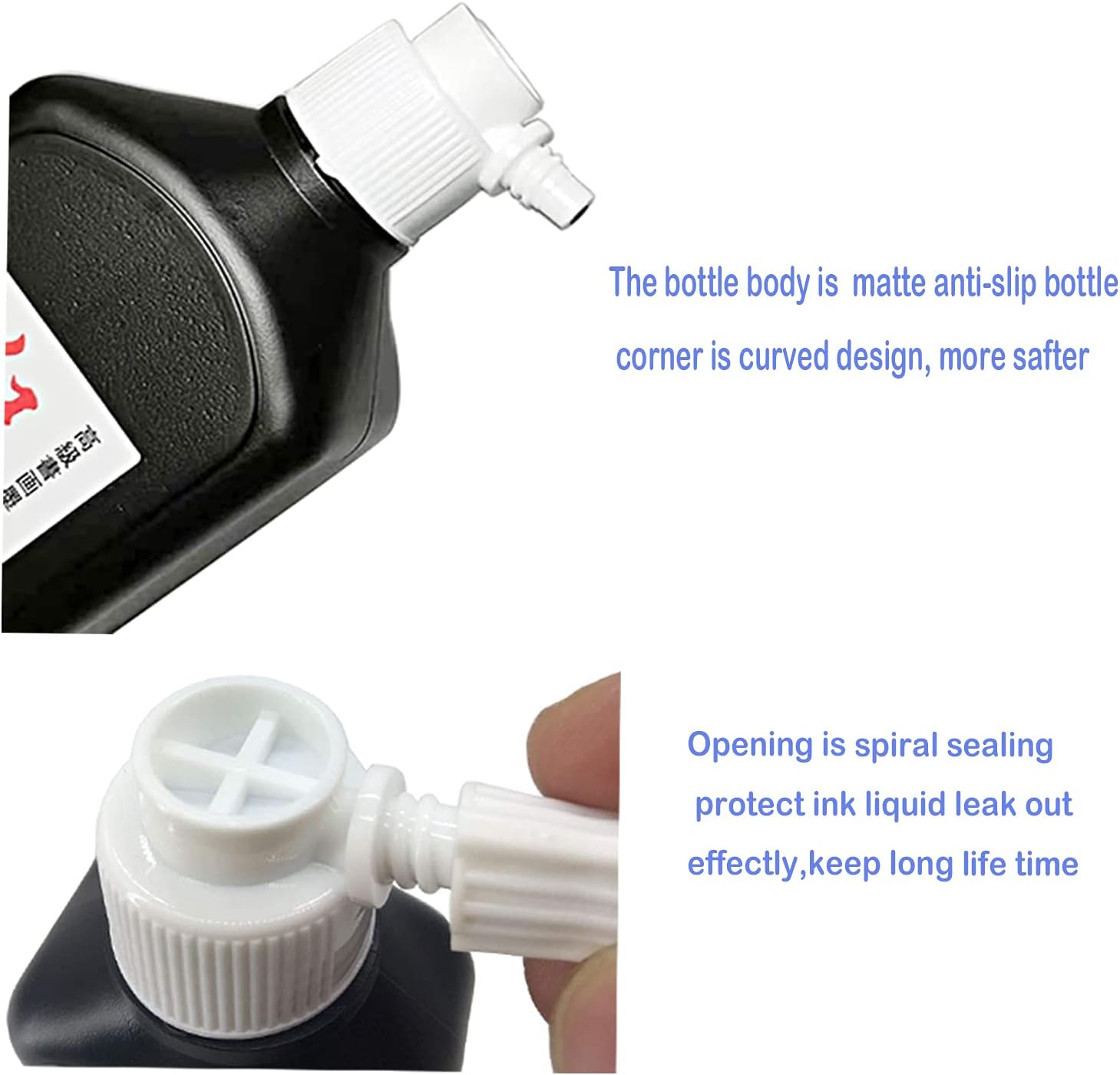- The bottle body is non-slip design, the curved bottle corner is more safe. The opening is spiral sealing with good sealing,can protect liquid leak out and keep long life time.