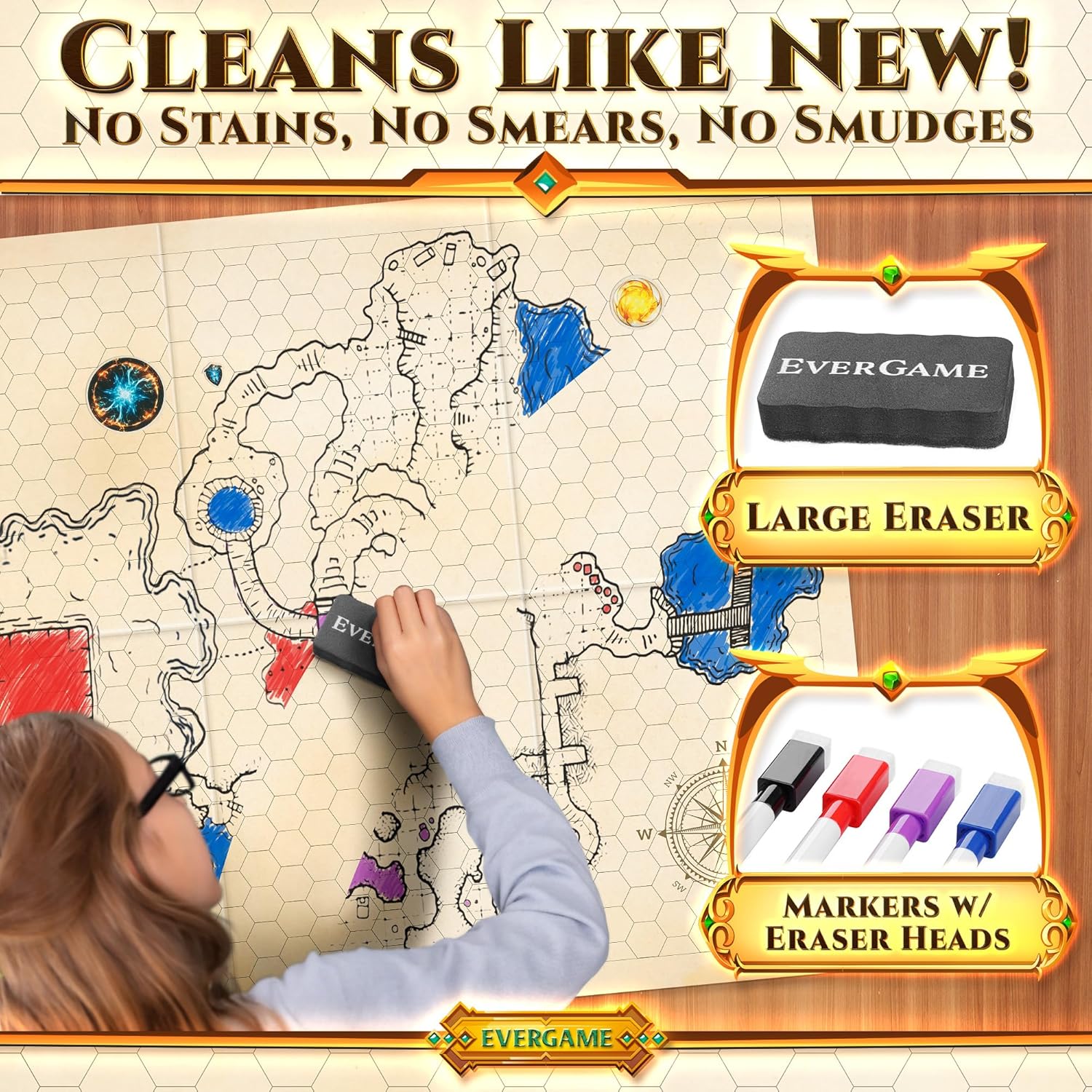 10 DND Game Mats and a lot More - Includes 6 Dungeons & Dragons Board Game Battle Maps (1" Hex Grid), Huge Size 22x26-4 3D Battle Arenas, 140+ Reusable Stickers, 4 Markers & Eraser, by EverGame