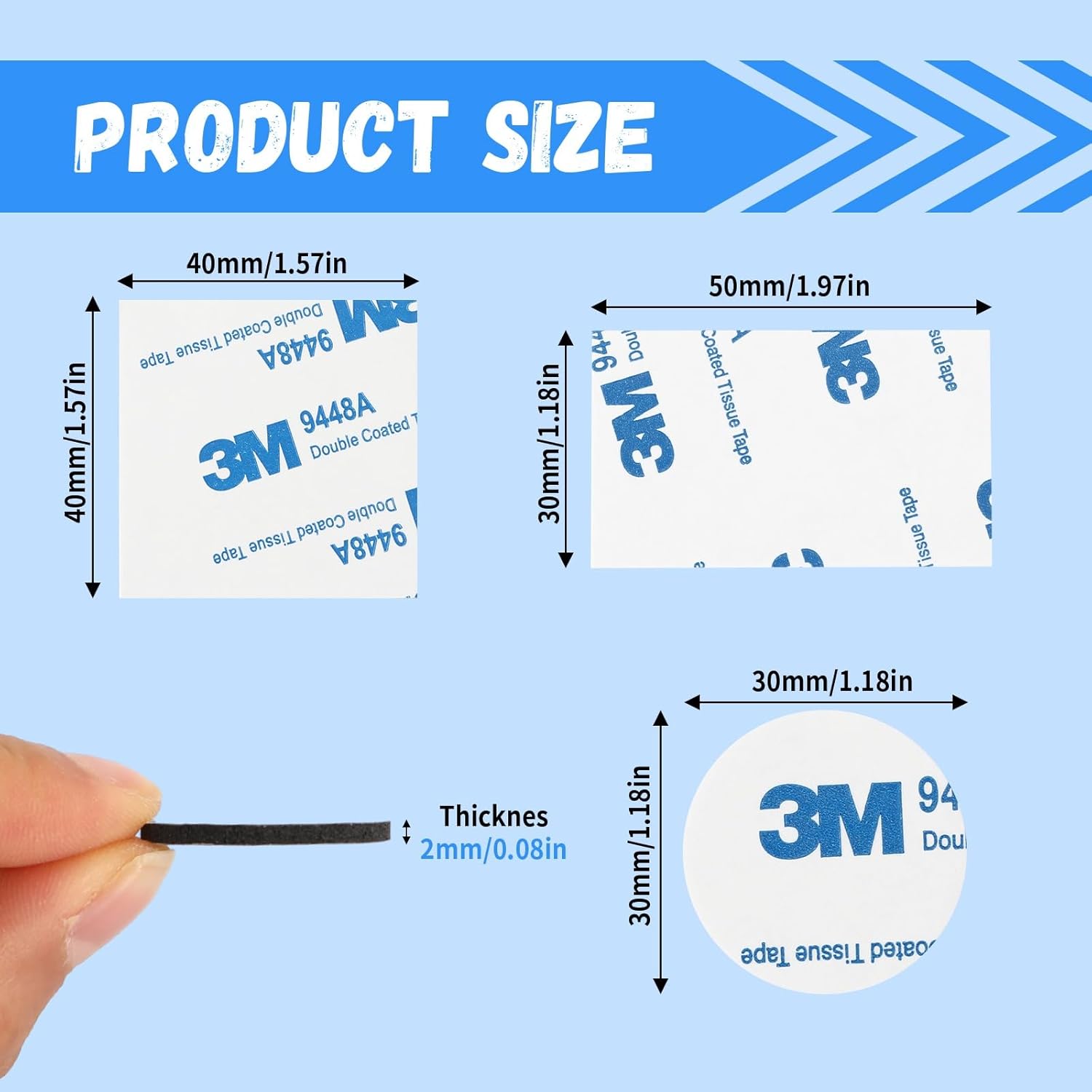 - 【What Will You Receive】 You will receive 60 pieces of double-sided adhesive pads-20 pieces of square (40 x 40 mm/1.57 x 1.57 inch). 20 pieces of rectangle(50 x 30 mm / 1.97 x 1.18 inch), 20 pieces of round(25 mm / 0.98 inch, thickness: 2 mm. Our two sided tape heavy duty can be cut to meet your different needs, enough for a family to use for a period of time. 3m double sided tape can be used for various DIY crafts, party, cars, home and office decorations, etc