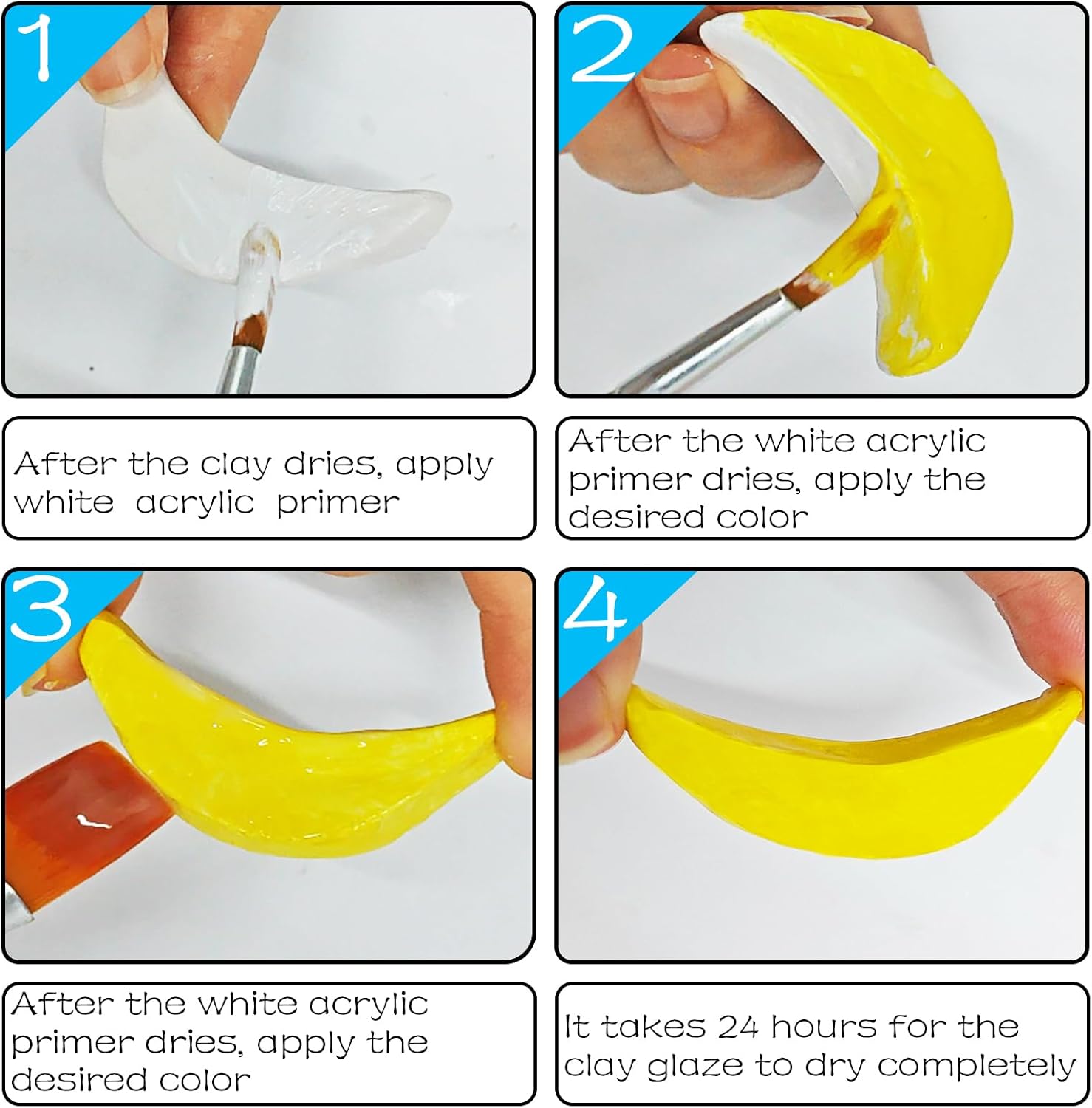 - Steps to Use: 1. After the clay work is dry, give it a thick layer of white acrylic primer, 2. Wait for the primer to dry, then apply the desired color, 3. Wait for the color to dry, then apply our air dry clay paint, it takes 24 hours for air dry clay glaze to dry completely