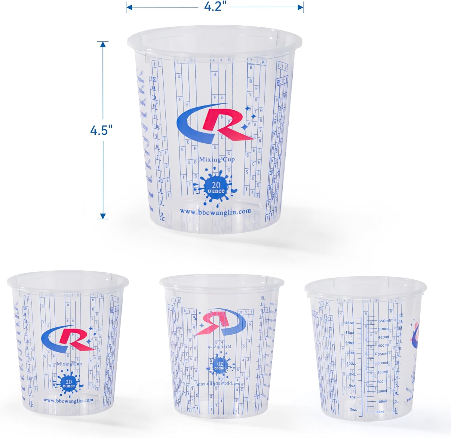 - 12PCS 20 Ounce (650 ml, 22 oz. total capacity) Clear Graduated Plastic Mixing Cups. Excellent for use with CR CHRWLIN paint mixing sticks, paint strainer and spray gun.