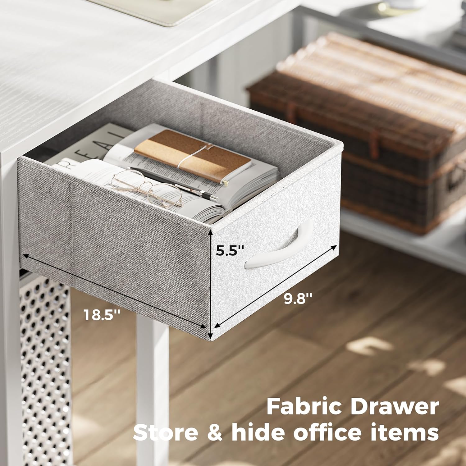 - ăDesk With StorageăThe desktop and 2 storage shelves on the side allow you to store unlimited office supplies. The pc tower can be placed on the bottom shelf and there is a fabric drawer to store stationery and other privacy items. Super practical design