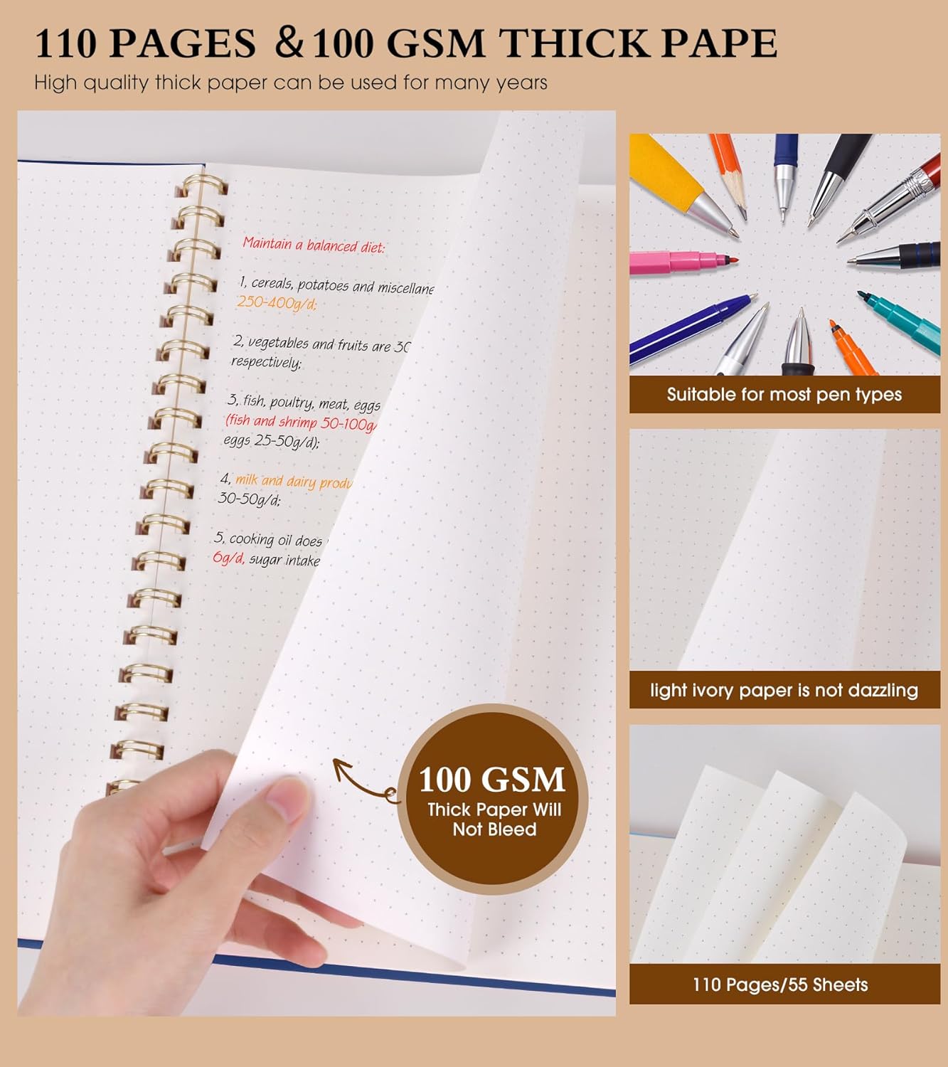- 【100 GSM Ink-friendly Paper】 Our navy spiral dot grid notebook pages are very thick, which avoids ink bleeding through and ghosting. Suitable for most pen types, such as ballpoint pens, fountain pens. Each dotted journal 55 sheets/110 pages, offering enough space to write in. Allowing you to write on both sides of every page to maximize your usable space. light ivory paper is not dazzling, let you have a comfortable writing experience.