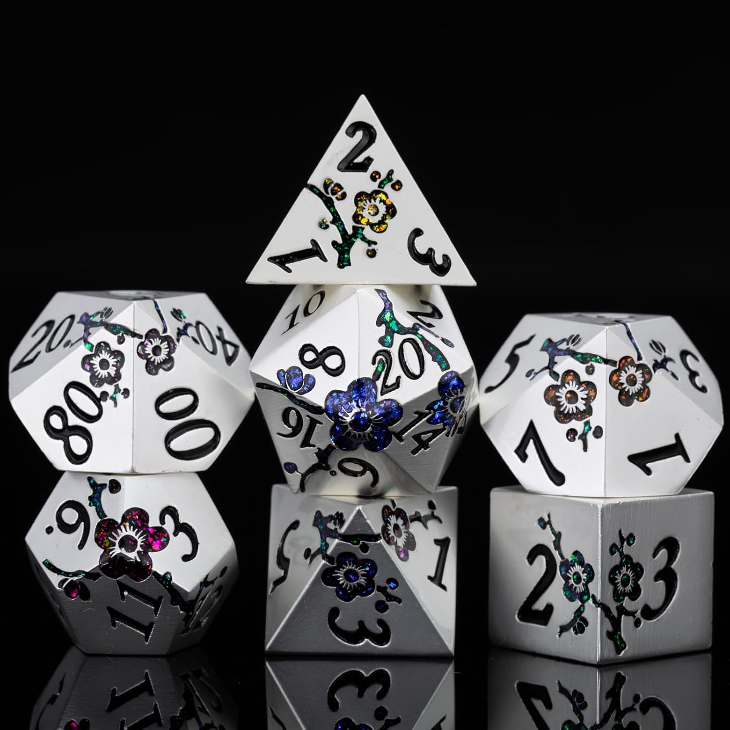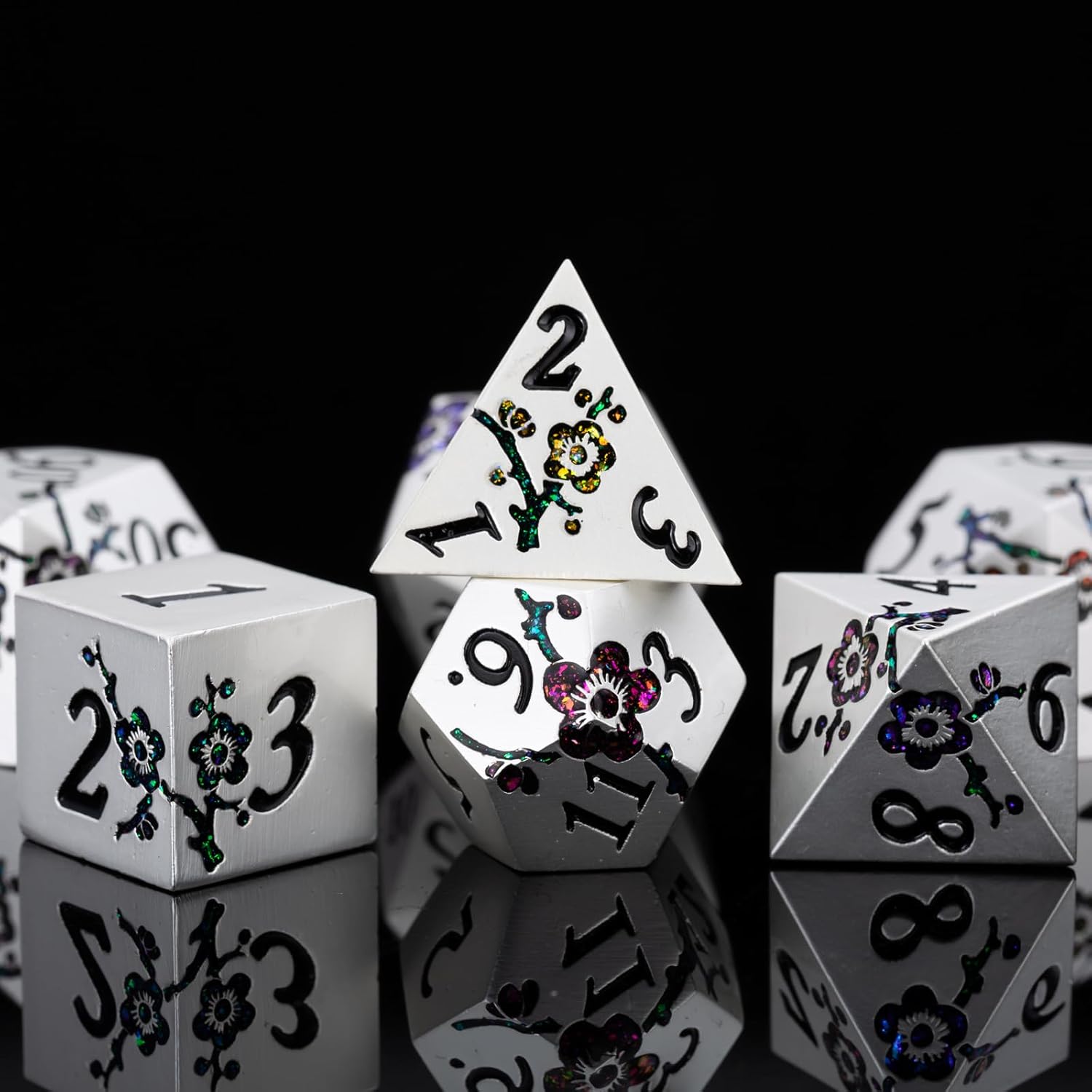7 PCS Solid Metallic Flower D&D Dice Set,Metal Dungeons and Dragons Dice Set with Gift Box for DND Tabletop Game (Silver-Seven Colour Brocade)