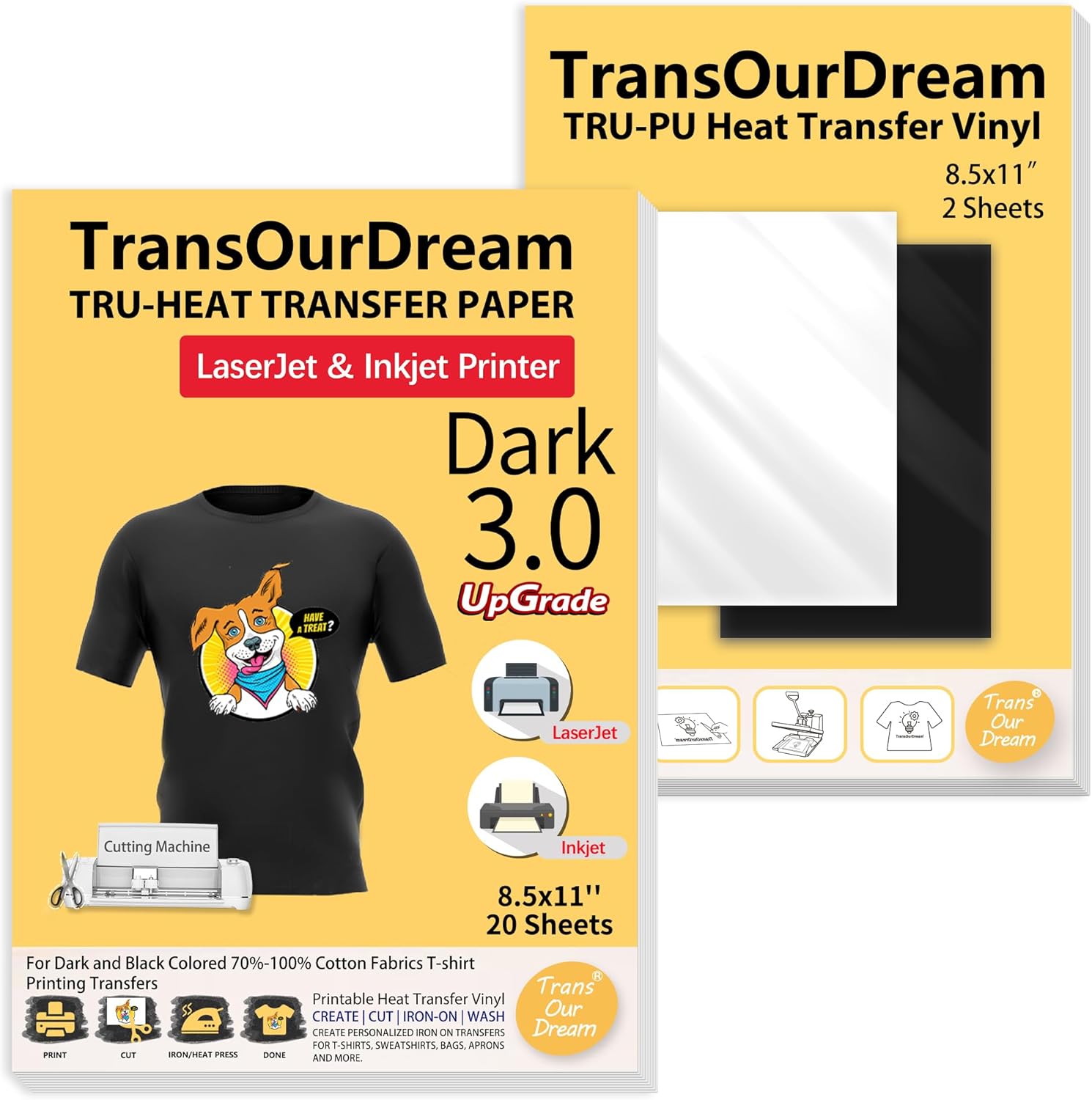 TransOurDream Iron on Heat Transfer Paper for Dark Fabric (20+2 Sheets, 8.5x11") Printable Iron on Transfers for Inkjet Printer & Laserjet Printer, Heat Transfer Vinyl for T Shirts (D3-BW-22)