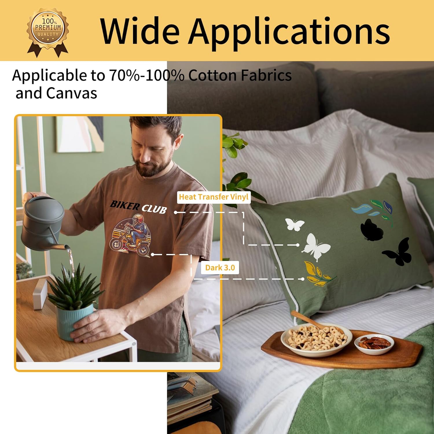 - 💕APPLICATIONS: Transfer text, images, photos and pictures onto Black and Dark color 70%-100% cotton fabrics, such as T shirts, hoodies, totes, canvas bags, aprons, masks, pillow cases, cushion covers, tablecloths, flags and banners. Make custom DIY gifts to your friends or family on Mother's Day, Father's Day, Birthday, Thanksgiving, Easter, Halloween, Christmas, Valentine's Day or Wedding Day.