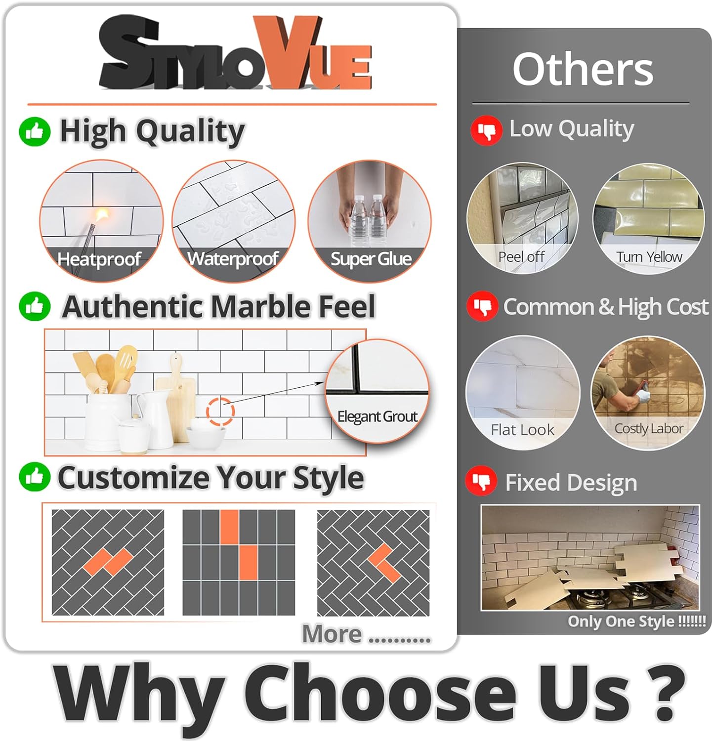- ๐๐ฅ๐๐ฏ๐๐ญ๐ ๐๐จ๐ฎ๐ซ ๐๐ฉ๐๐๐: Featuring unique slot edges for a realistic grout-look, StyloVue self adhesive wall tiles offer an authentic design and texture that customers adore. Elevate the aesthetic of your space while simplifying maintenance and cleaning, without the hassle of traditional grouting.