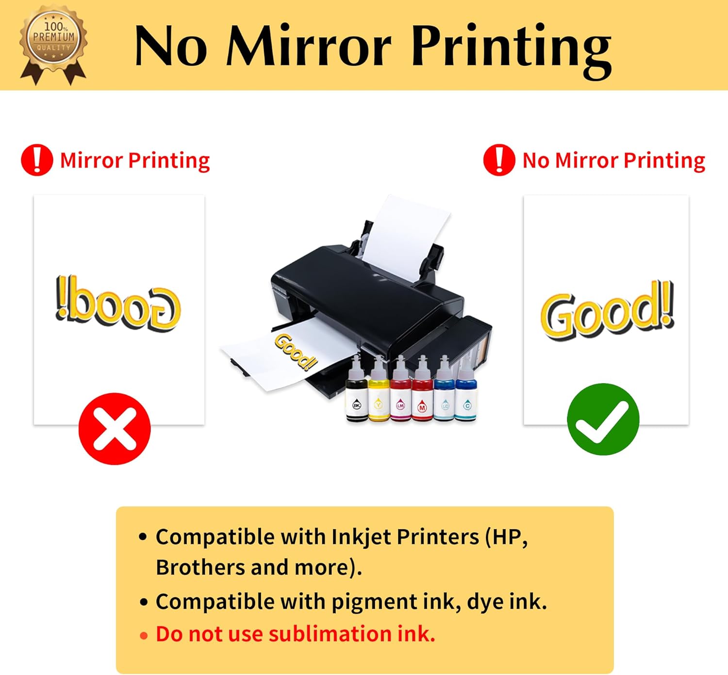 - 💕REQUIREMENTS: Inkjet Printers (such as HP, Brother and other brands) | Pigment Ink or Dye Ink (Do not use Sublimation Ink ) | Scissors or Cutting Machine | Iron or Heat Press machine | Teflon Paper (included in the pack).