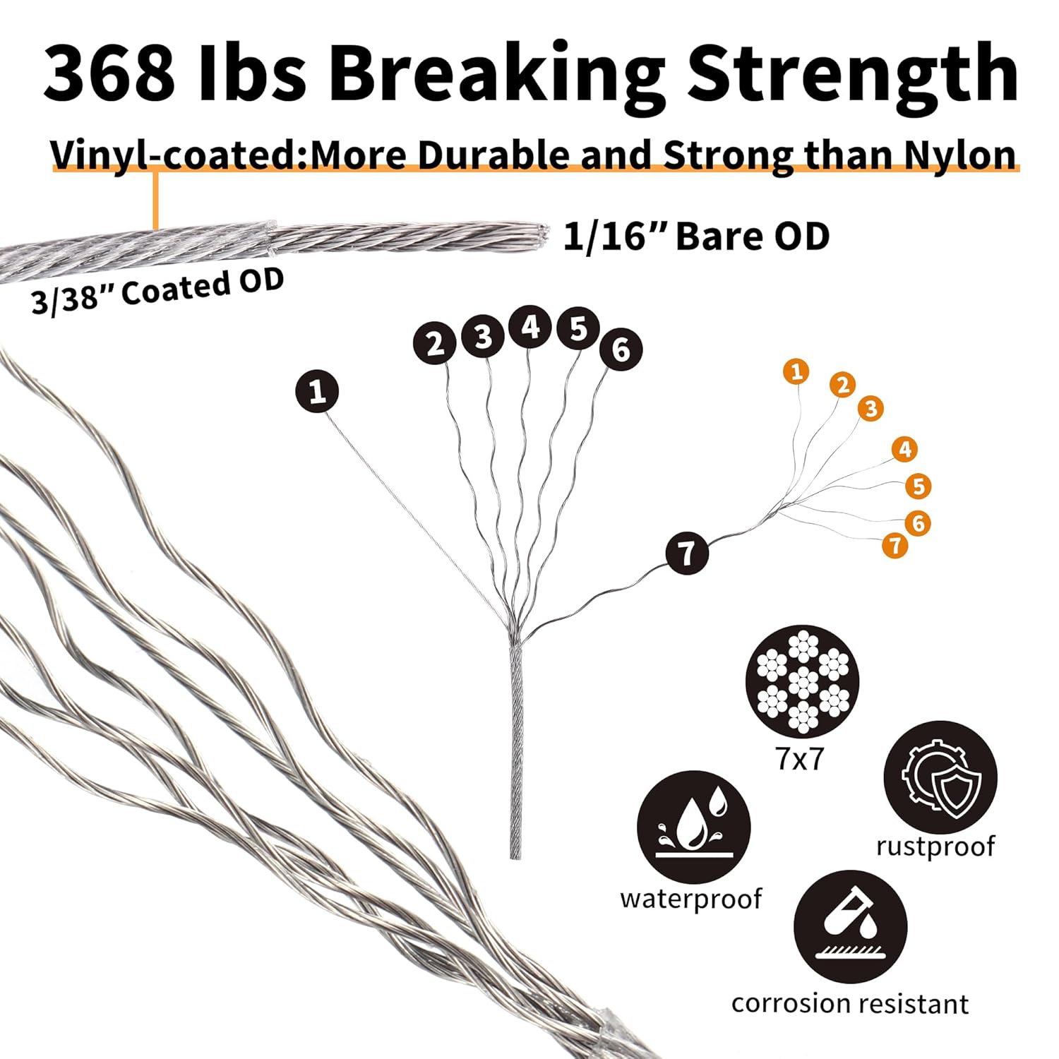 - 🧵【Strong and Durable】Our wire rope is made of 304 stainless steel with 7X7 structure, stretched 4 times by the water tank, it is not easy to loosen the strands, with stronger carrying capacity, toughness and durability, and the breaking strength of 368 lbs.