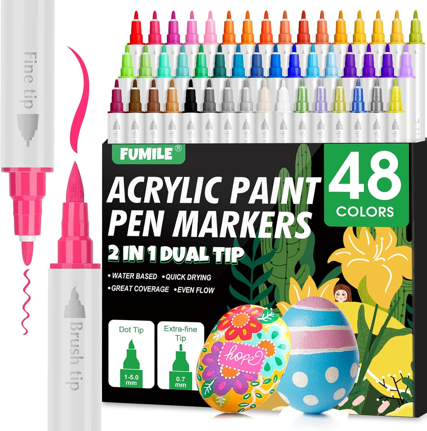 - 【Vibrant and Rich Colors】FUMILE 48 acrylic paint markers come in 36 classic colors,6 metallic colors and 6 Morandi colors.Multiple colors meet your diverse creativity,Unique metallic colors can make your creations more diverse.Acrylic pens can be used to make Easter eggs,pumpkin painting,canvas shoes,wooden paintings, holiday cards, etc