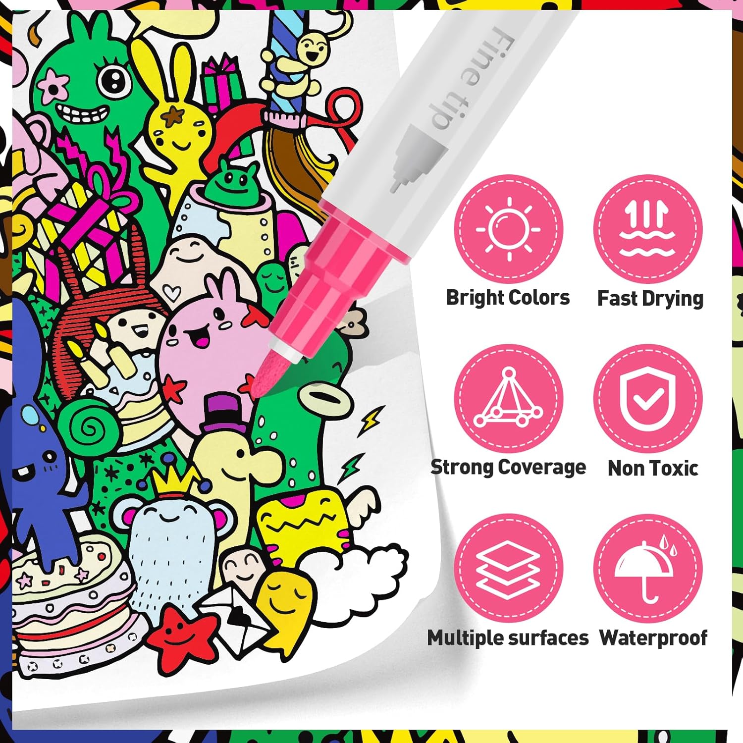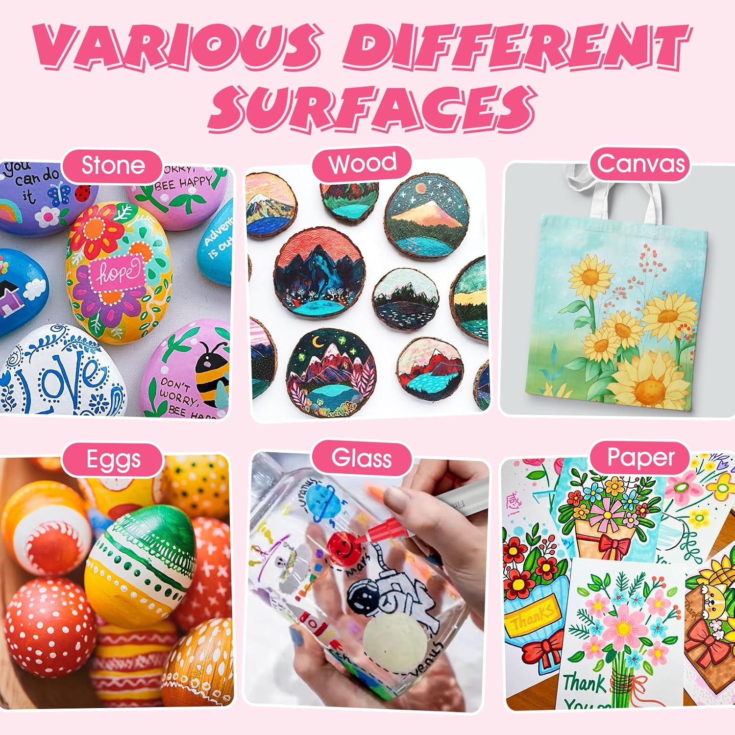 - 【Widely Used】Acrylic paint pens have the characteristics of strong coverage,quick drying,and smoothness, making them suitable for various surfaces.such as canvas,wood,metal, rock painting,glasses,plastic,paper,ceramics,and more.