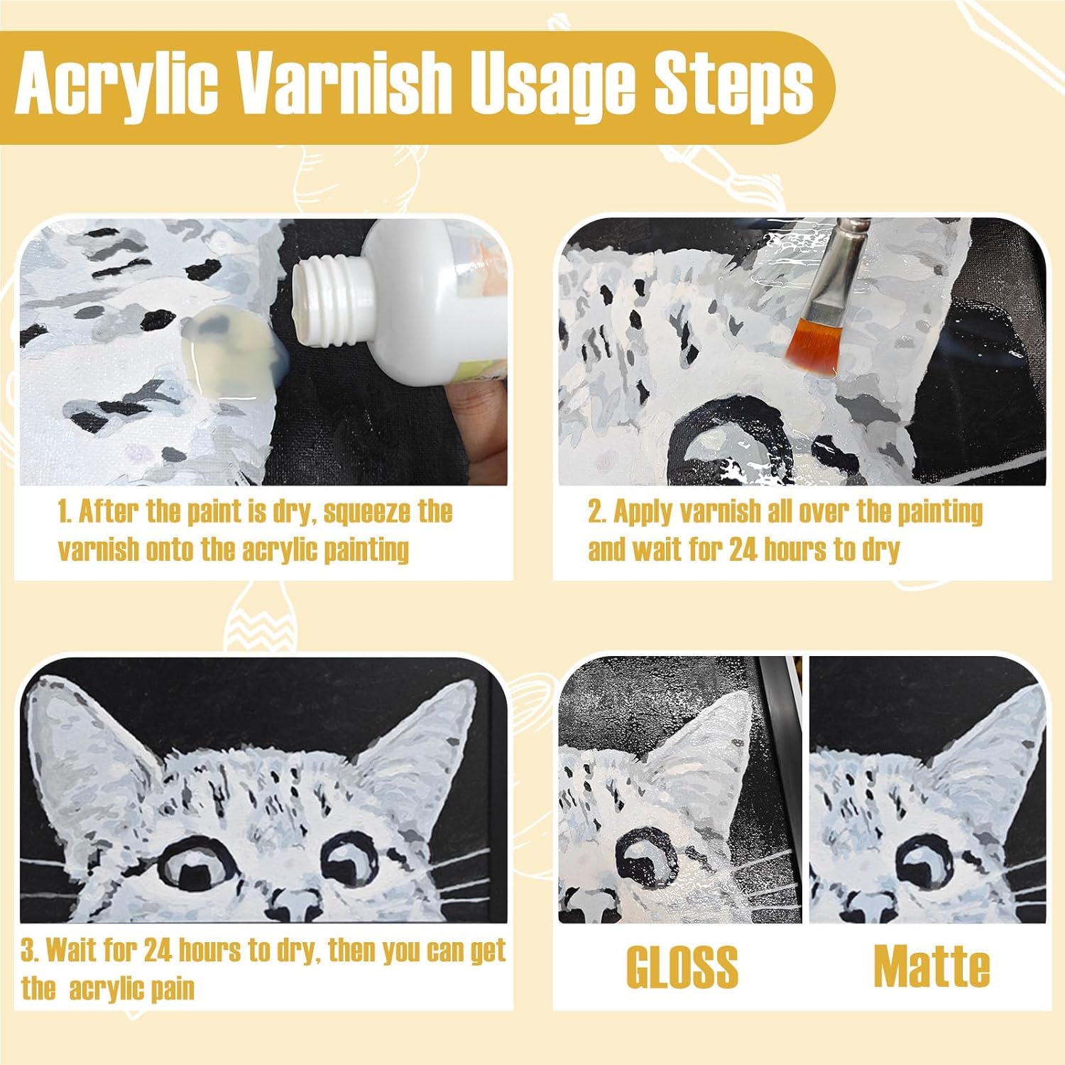 - Steps of Use: After the painting is finished, wait for the painting to dry completely; after the painting is dry, After the acrylic paint has dried thoroughly, apply our acrylic varnish; After applying the varnish, wait for 3 hours for it to dry thoroughly; After 3 hours, the painting will be protected by a permanent glaze effect