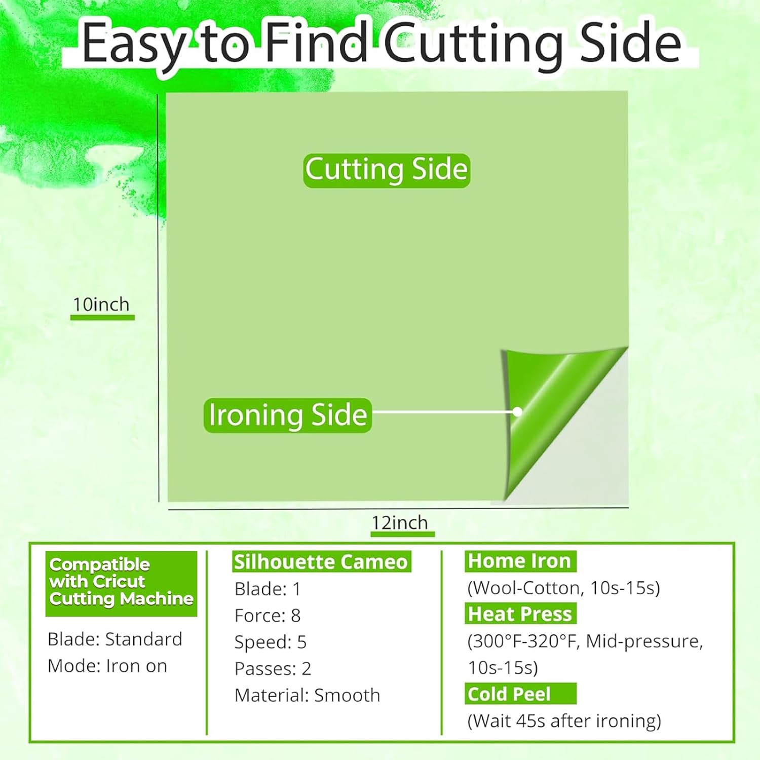 - 🎁Easy to use🎁 Our green gradient heat transfer vinyl is very suitable for handmade novices and professionals. It has 12 pack bright htv and 1 teflon sheet, which can be used well together. Please pay attention to the relevant parameters <300°F~ 320°F, medium pressure (5~8kg), 10s~15s>, if you have any related questions, please contact us in time