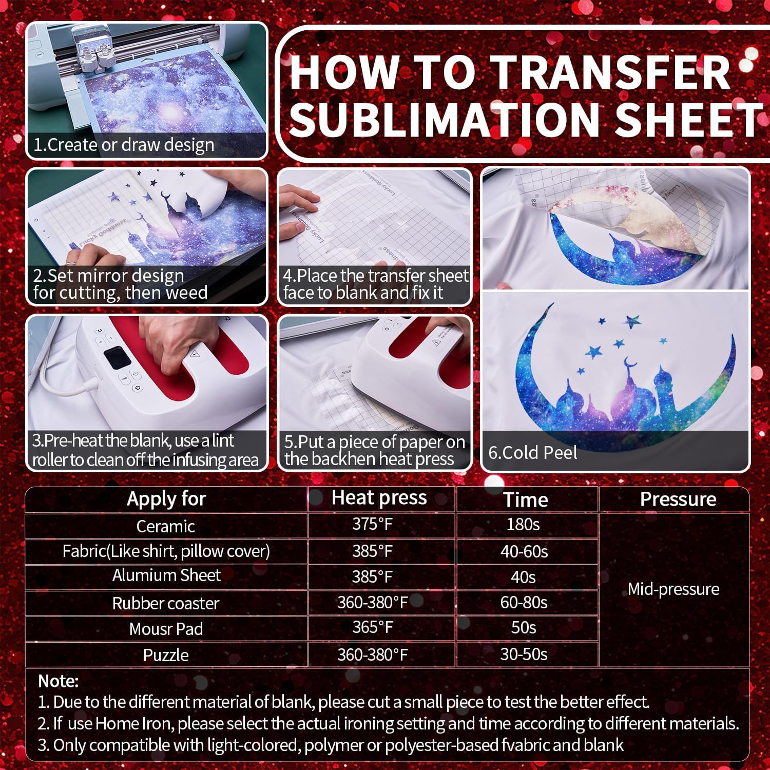 - 【COMPATIBLE DEVICES】These sublimation paper are compatible with most major brands of cutting and heat press machine, or household iron.Sublimation transfer paper will bring you unlimited creativity and imagination.Only compatible with light-colored, polymer or polyester-based fabric and blank.Setting parameters of different machine strength modes are different, please adjust the cutting machine before use. You could cut a small piece to test.
