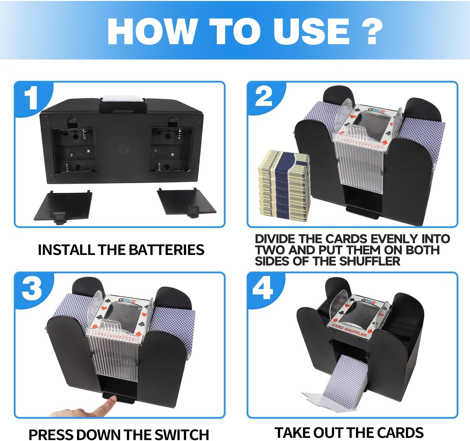 - Automatic Card Shuffler:Just insert the cards into the two openings, and press the switch at the bottom of the card shuffler, with the machine shuffling quickly and efficiently; shuffles one to four decks of playing cards in seconds, saves your time; the shuffler dimensions are 8.25" L x 3.75" W x 7.5" H