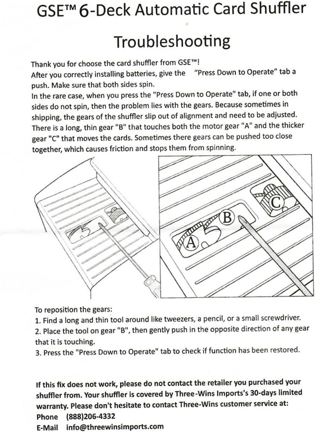 - Important Tip: The card shuffler requires four C batteries if you use batteries to operate ( batteries not included); flat cards and new cards work great, bend cards or old cards may not work (playing cards are not included), We added a troubleshooting sheet inside each packaging