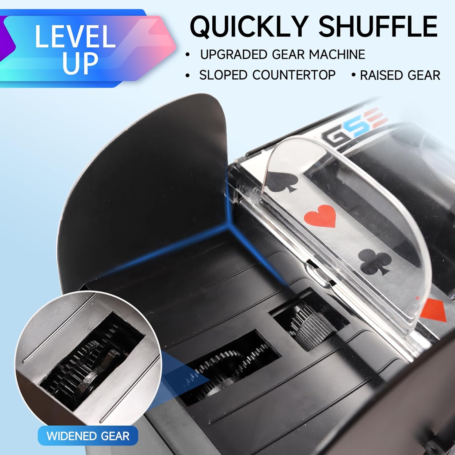 - Card Shuffler: The automatic card shuffling machine is made of high-quality ABS material; durable, with longer service life; not easily deformed; this shuffler is an upgraded model, using the latest imported motor, with lower noise; the width of the gears has been modified to be wider, providing more contact area with the playing cards, offers more sensitivity, and makes shuffling easier and smoothly