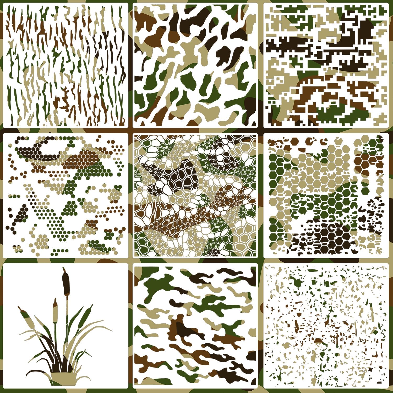 - Package Includes:9pcs Camouflage stencils for painting,each stencil measures 12x12inch.Great for Window Spraying,Door Mat Decorating and Wood Painting.