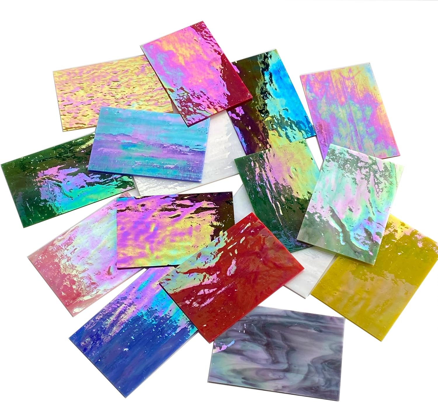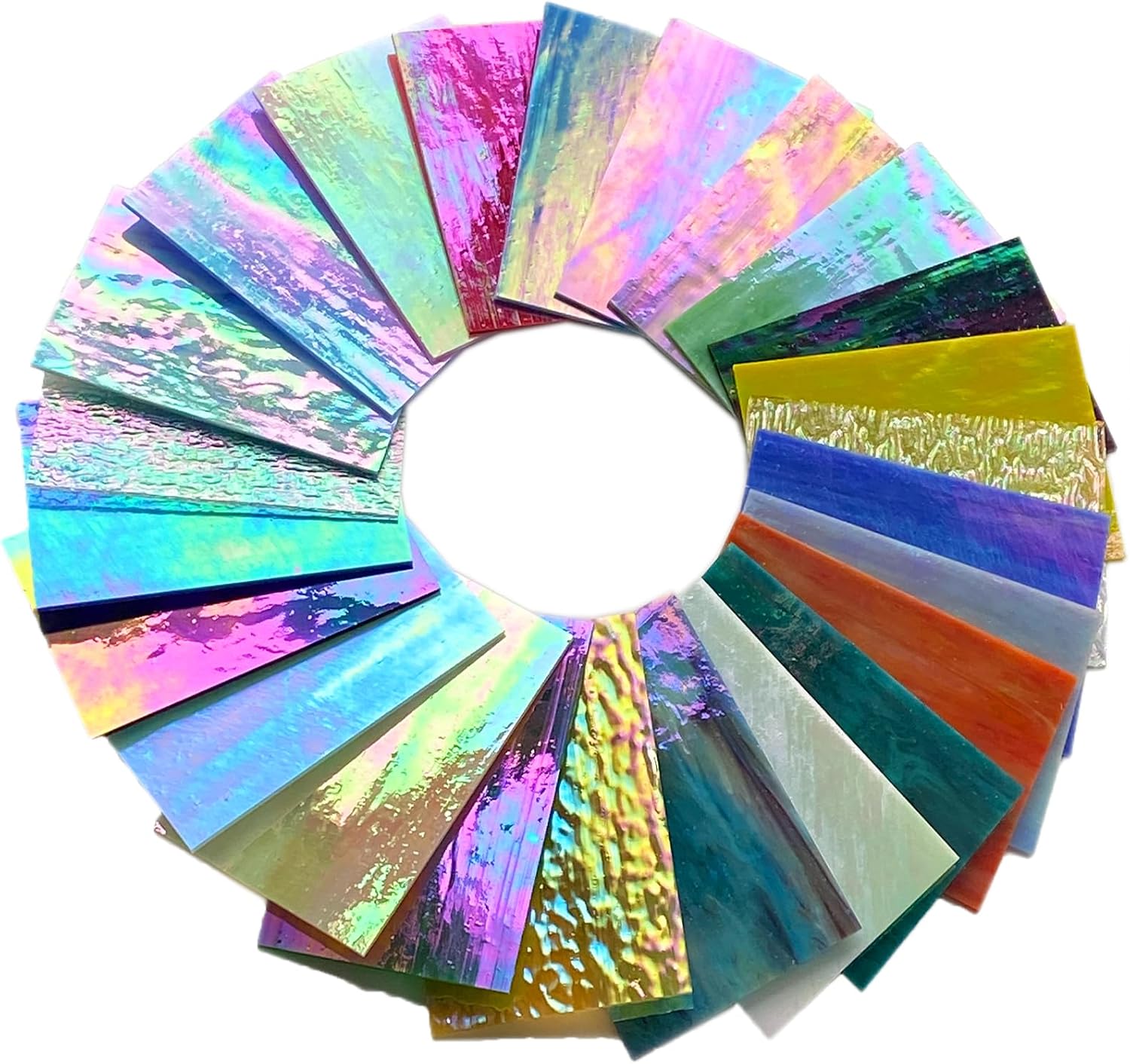 24 Sheets Iridescent Stained Glass Sheets Variety Pack, 6 x 4 inch Iridized Art Glass Mosaic Tiles for Crafts, Stained Glass Supplies for Stained Glass or Mosaic Projects