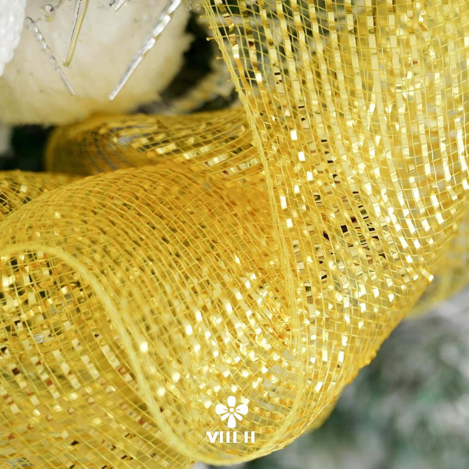 MEEDEE Gold Deco Mesh 10 Inch Deluxe Wide Foil Metallic Pull Up Mesh Yellow Gold Decorative Mesh Ribbon for Christmas Tree, Wreaths, Garland, Gift Wrapping, Bows Making (30 Feet)