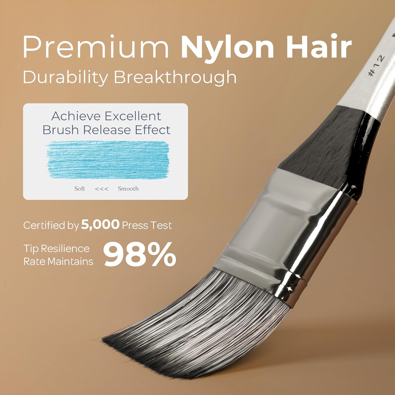 - Premium Nylon Bristles: Made of high-quality nylon with excellent absorption and quick paint release to save paint usage and painting time. Features superior elasticity and no shedding of bristles for smooth, even and consistent paint application. And it's so easy to clean, simply clean brushes with warm water immediately after use or follow the paint manufacturer's instructions, and reshape the brush tip