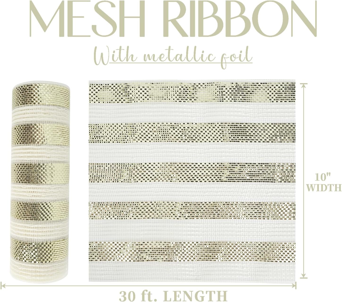 MEEDEE Cream Cotton & Deluxe Metallic Champagne Striped Deco Mesh - 30 Feet for Christmas Tree, Wreaths, Garland, Gift Wrapping, Bows Making