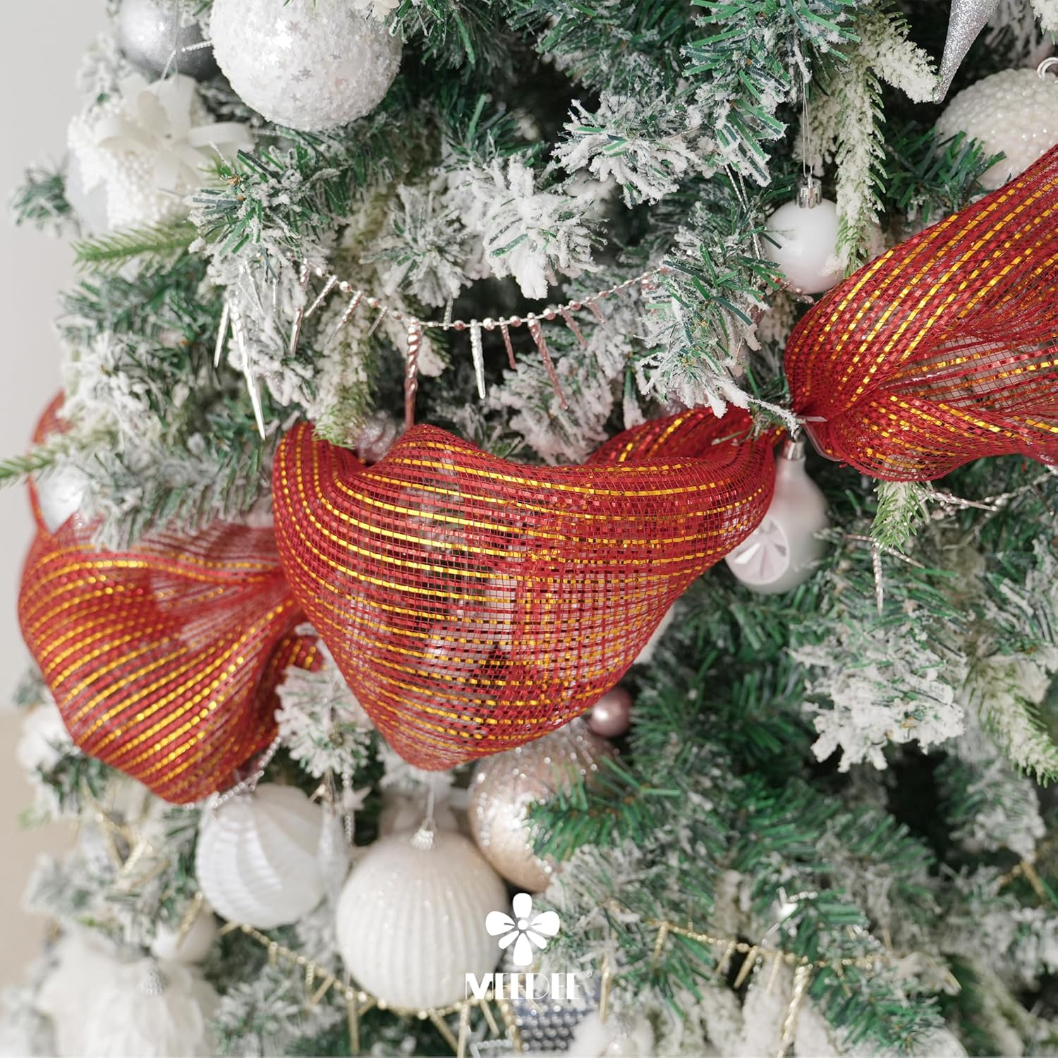 - A 10 inch wide, 10 yards roll of red metallic strips alternate with gold metallic strips for an ultra shiny mesh with a glam, metallic look. Great texture and sparkle that works for multiple themes. Whether you're making a wreath, a garland, or a bow, the beautifully full ruffles, curls and poofs that you fix into your design will stay that way.