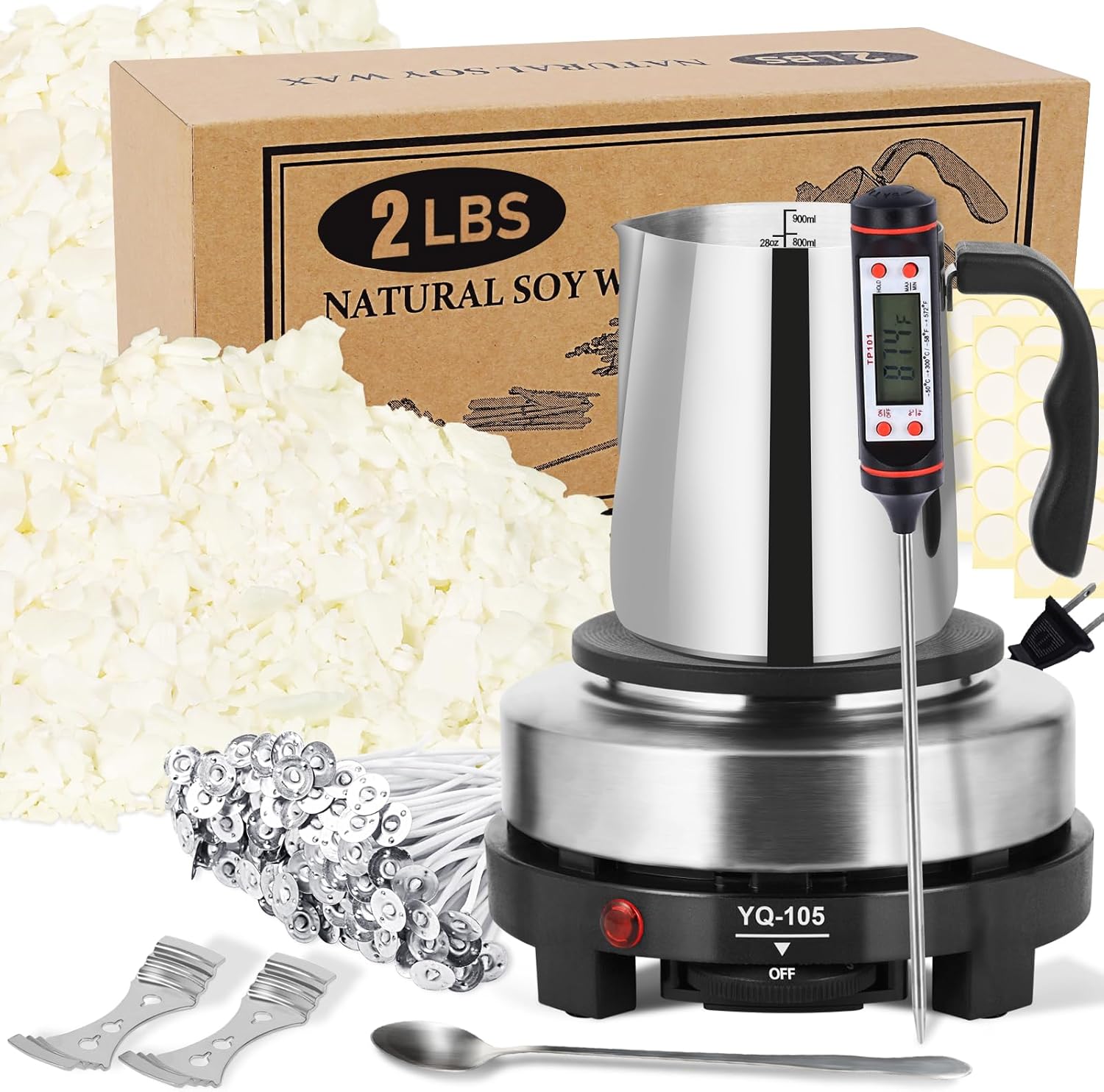 - 🎁【Candle Making Supplies】Candle Making Kit Includes electric hot plate for candle wax melting, 2lbs of organic soy candle wax, 50 cotton candle wicks, 1 stainless steel pouring pot, 2 stainless steel centering devices, 1 stainless steel spoon, 60 candle wick sticker,1thermometer. DIY candle making kit supplies suit for beginners.