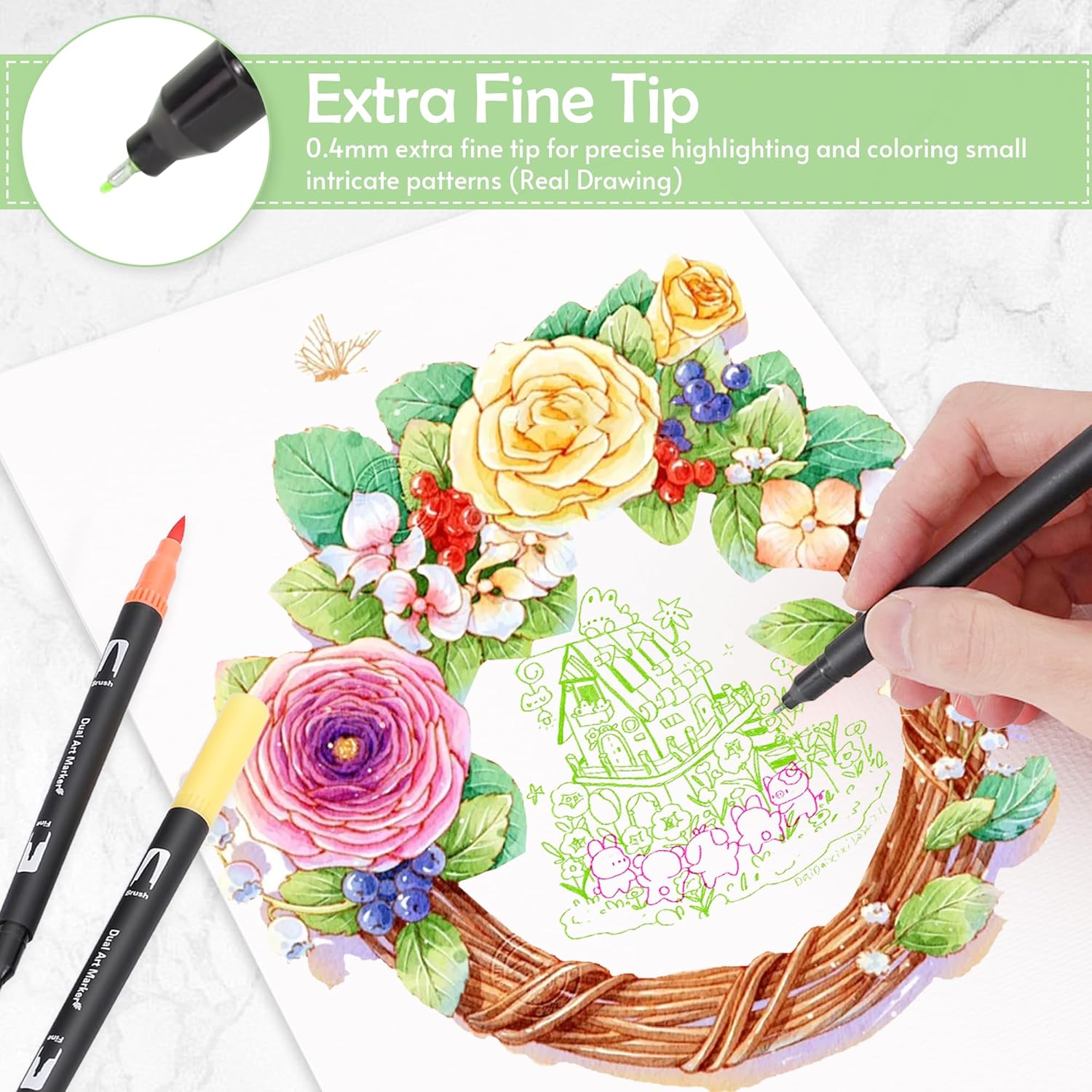 - 🎨 Convenient Dual Tip Paint Markers: Each watercolor marker features two different tips to meet different coloring needs, eliminating the hassle of switching nibs and offering greater convenience for your creations. The 0.4mm fine tip is perfect for sketching outlines and adding details, while the 1-2mm soft brush tip is ideal for shading and quickly coloring large areas in your art projects. Whether you're a beginner or a professional, you can fully unleash your creativity!