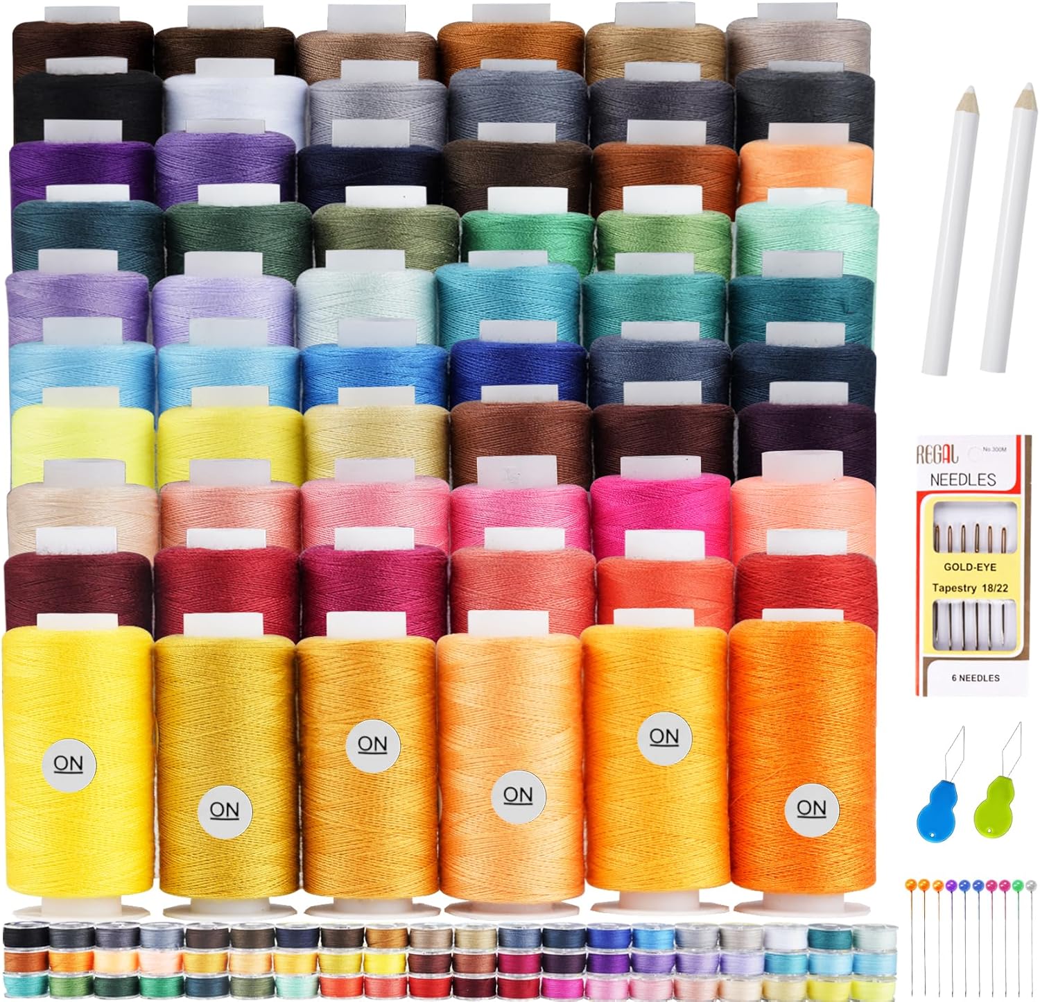 - Sewing Thread Kit: 60pcs different colors sewing thread and 60pcs different colors prewound bobbins with cases. We have also added sewing accessories to better complete your sewing projects: 2 extra rolls of white sewing thread + 2 extra rolls of black sewing thread + 6 needles + 2 threaders + 10 bead needles + 2 sewing marker pencils.