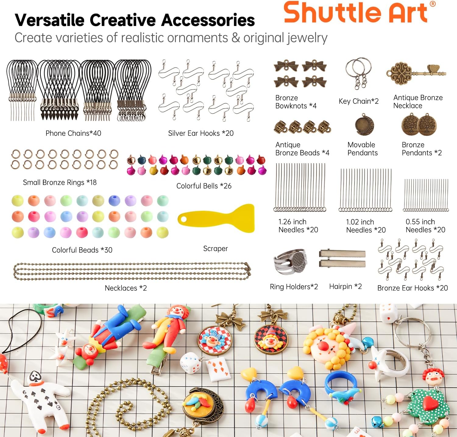 - 112 COLORS POLYMER CLAY KIT: Shuttle Art polymer clay set contains 112 vibrant colors of 0.7 oz/block oven bake clay, together with 20 useful clay tools and 16 kinds of accessories. Ideal modeling clay for both kids and adults to make small ornaments, model animals, characters, etc