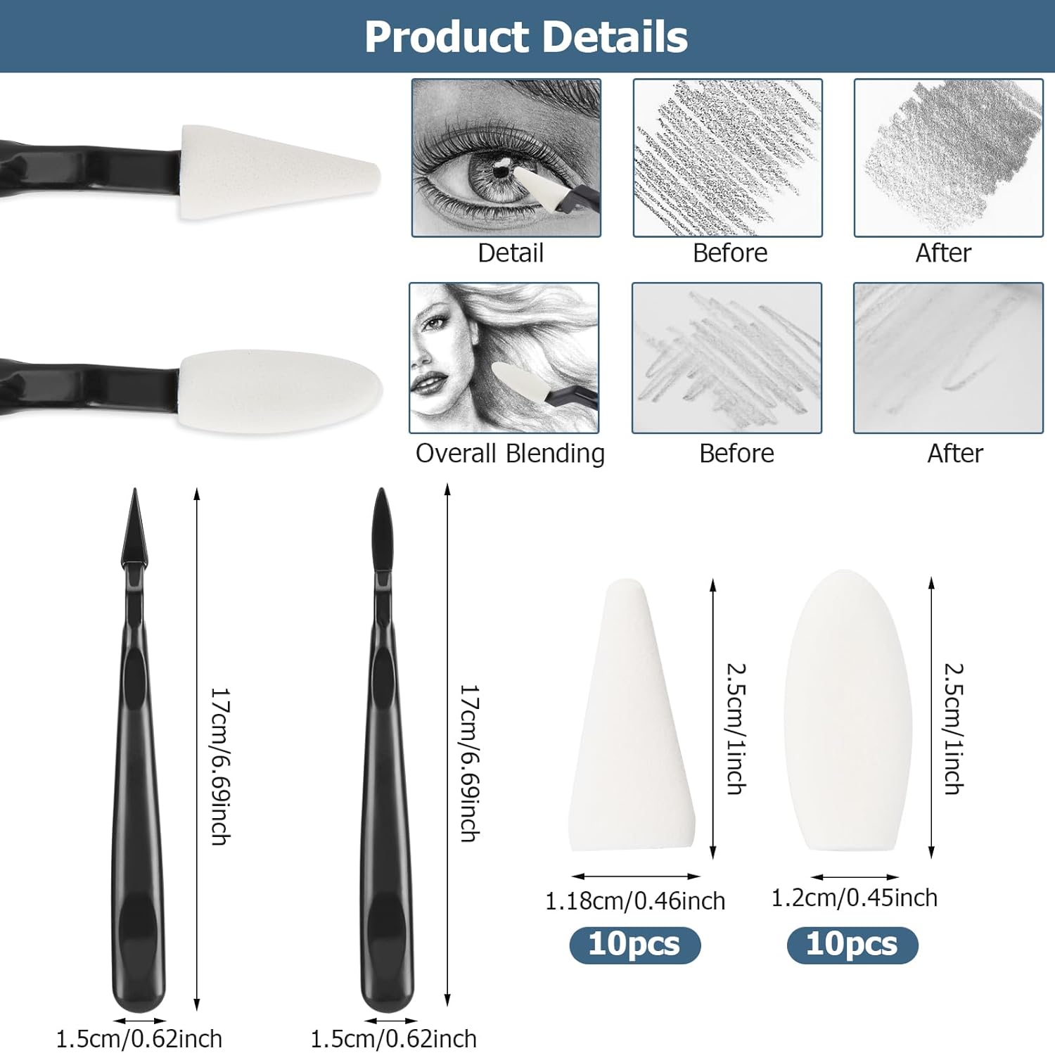 - Package inclusion : The package includes 48 pieces of blending stumps,the sizes are 5, 6, 7 and 8, 1 pieces for each size;blending stumps the sizes are 1, 2, 3, 4, 2 pieces for each size;tortillions the sizes are 1, 2, 3, 4, 2 pieces for each size; 1 pencil extension tool; 2 sandpaper sharpen pads blocks; 2 kneaded erasers,1 sketch rubbing sponge, 2 sketch wipe scrapers, 20 sponge replacement heads (10 oval and 10 pointed) and 1 felt bag.