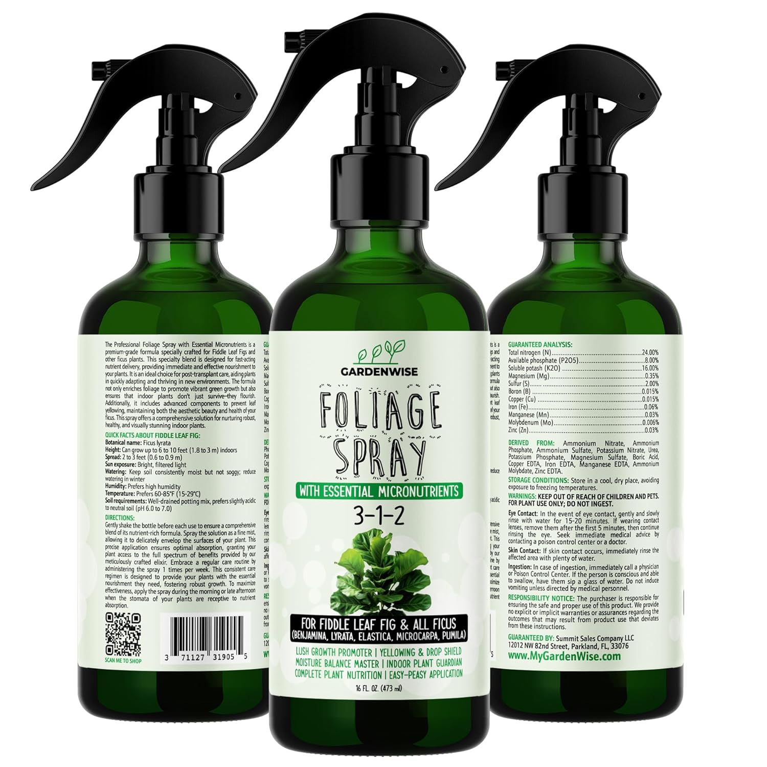 3-1-2 Fiddle Leaf Fig Foliar Spray - Plant Shine & Fertilizer - Premium Spray for Indoor Plants with Essential Nutrients - Fiddle Leaf Fig Plant Food & Fertilizer - Ready-to-Use (16 OZ)