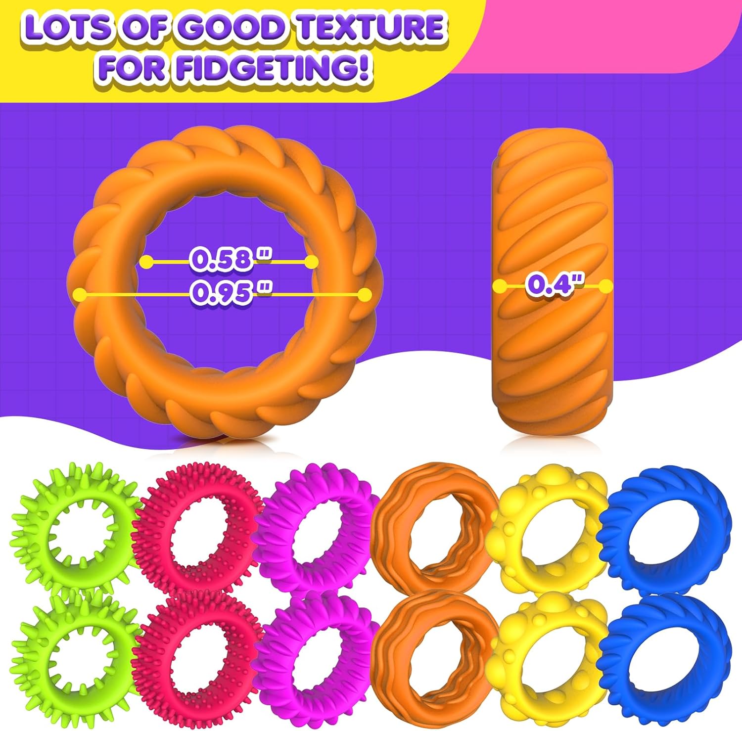 - TAKE THEM ANYWHERE: Portable spiky fidgets for kids rolling around fingers. Stretchy sensory rings are an ideal choice for a child who has attention deficit hyperactivity disorder, or autism and wants to increase their attention. The silent and lightweight sensory fidget pack can be used in class, school, library, church, airplane, or car to anti-anxiety and calm down, without bothering anyone