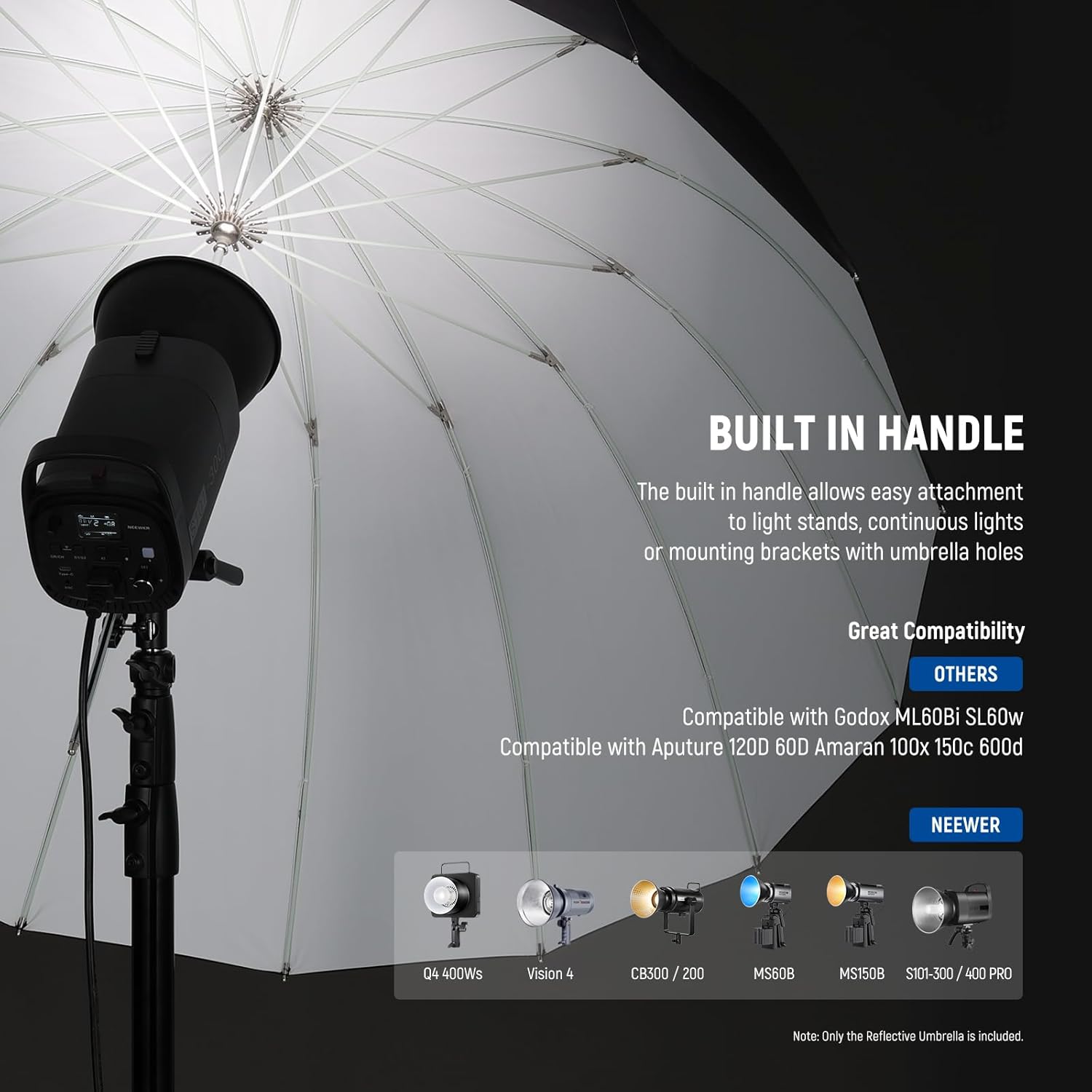 - 【71"/180cm Black/White Parabolic Reflective Umbrella】 This 71"/180cm deep parabolic umbrella softbox provides a softer and more evenly diffused light effect than the black/silver version, and preserves neutral color temperature for faithful color rendition. Perfect for group portraits or expansive landscapes. Its parabolic shapped design allow for a broader spread of light