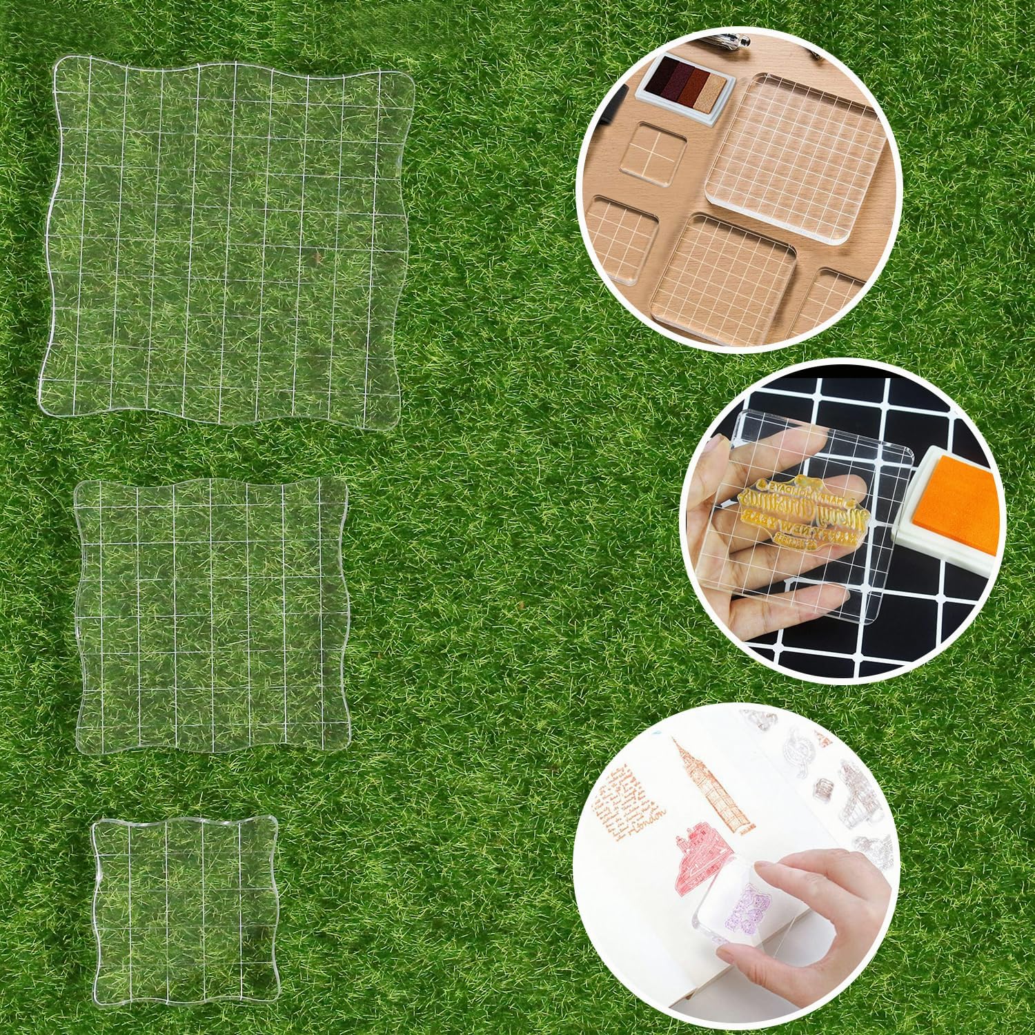 - Package Contents: 3 acrylic stamp blocks in 3 different sizes including 2 x 2 inches, 3 x 3 inches, 4 x 4 inches. Each is 0.31 inches thick. NOTE: This is a protective cover to protect the stamp block from scratches, please peel off the cover before use.