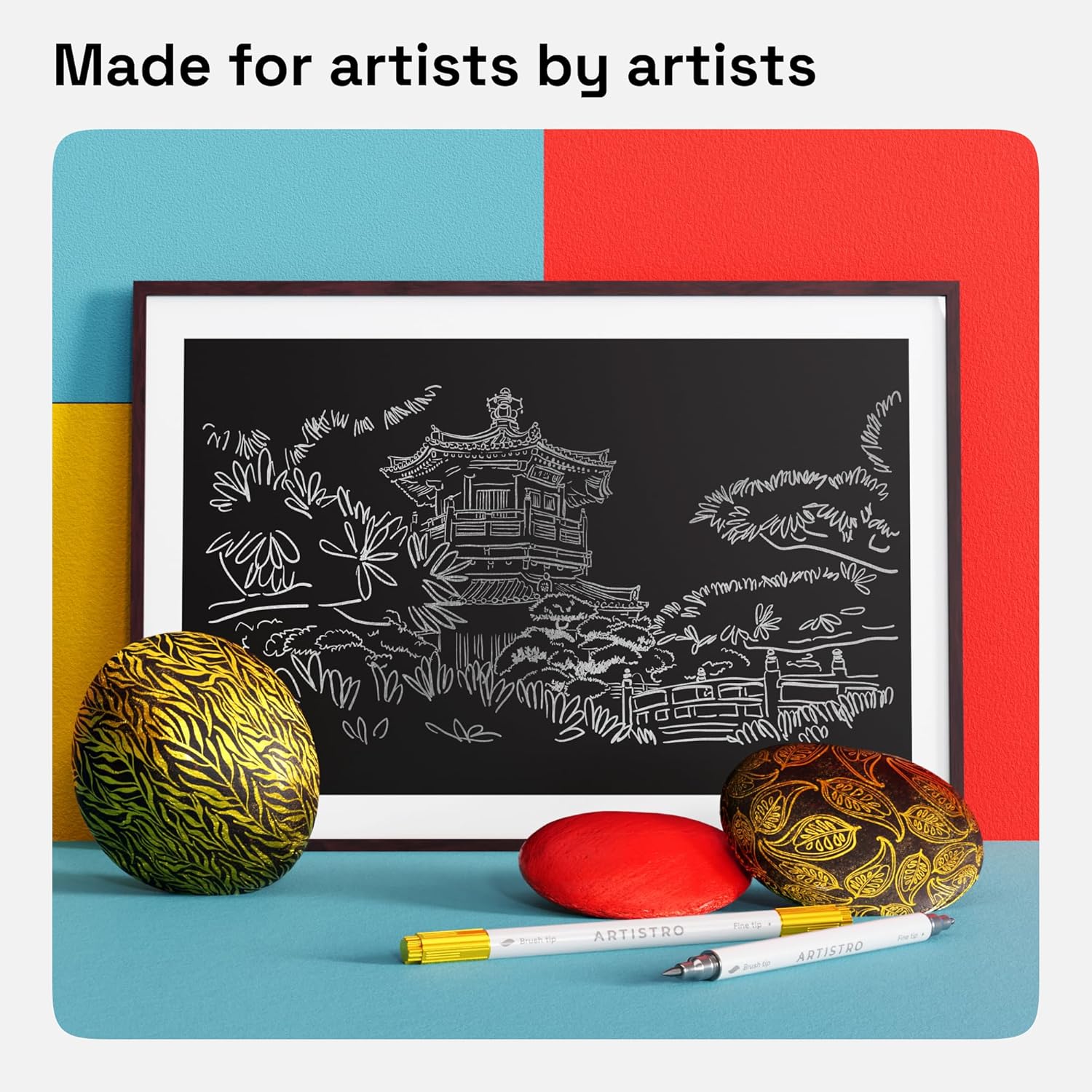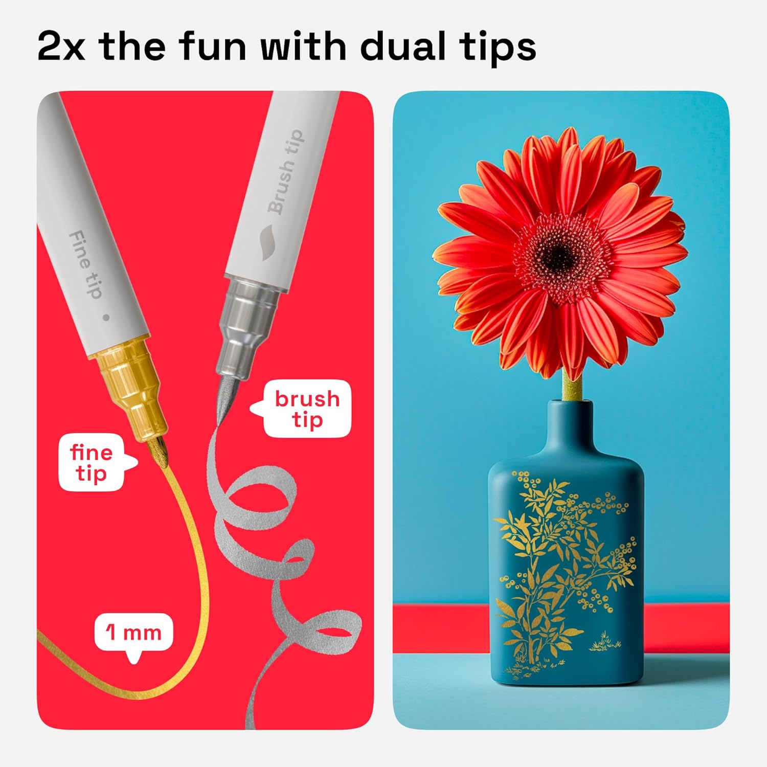 ARTISTRO 2 Gold&Silver Dual-Tip Acrylic Paint Pens - Multisurface Metallic Markers for Glass, Rock, Fabric, Wood, Plastic & More - 1 mm Fine & Brush Tips