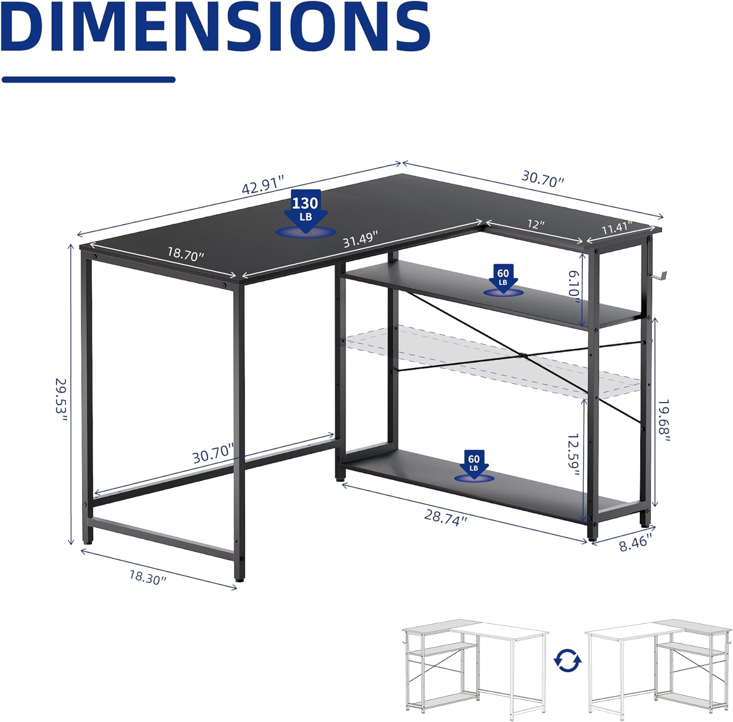 - Reversible Shelves -- The side shelf of the computer desk can be installed on the left or right side according to your space layout. It's a nice computer desk suitable for corners and small spaces. This allows for optimal use of corner spaces.