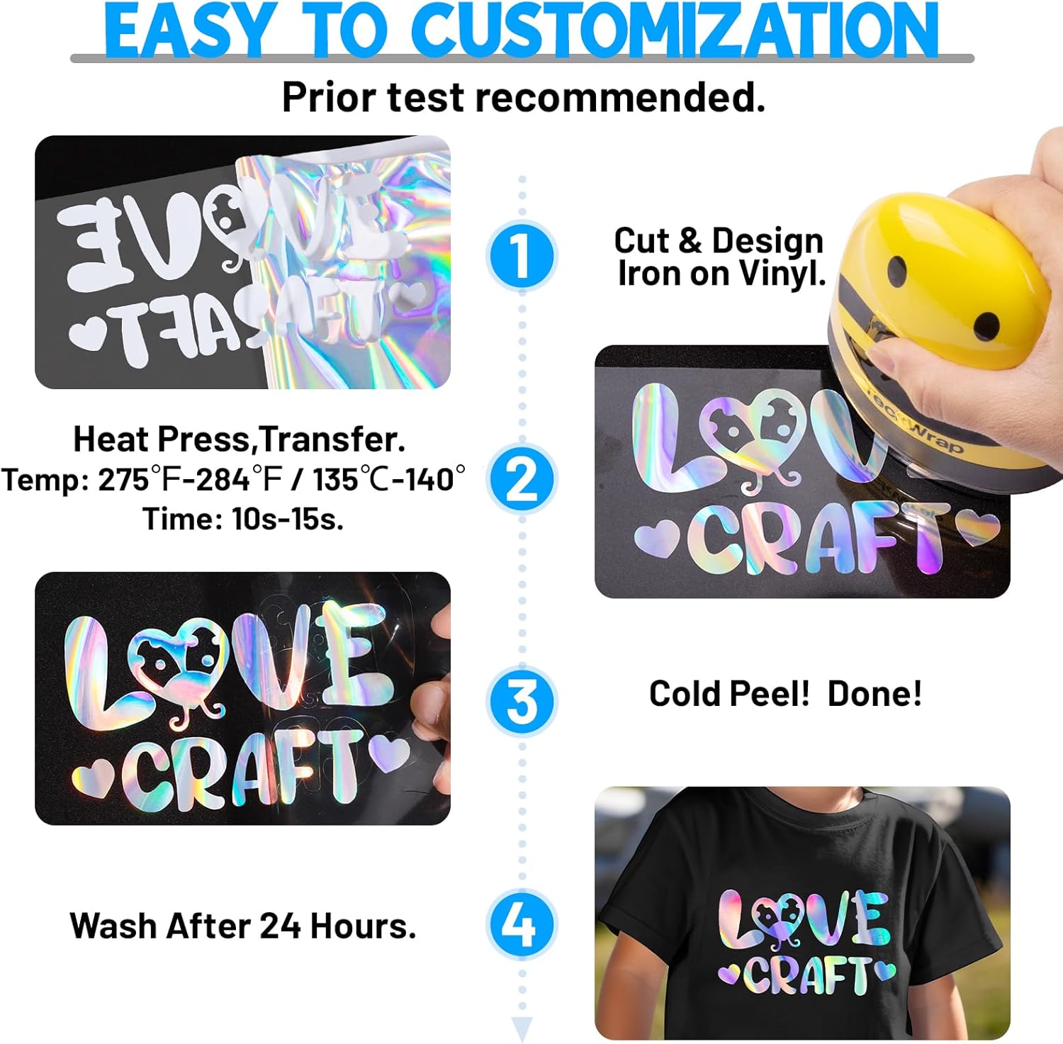 - Precision Cutting & Easy Application: Cut, weed, and apply effortlessly with our TECKWRAP heat transfer vinyl. For best results, simply mirror your design before cutting and apply with even pressure for 10-15 seconds at 275-300°F (135-145â) using a heat press machine for T-shirts. Whether you're using iron on vinyl heat transfer vinyl or heat transfer foil, this easy process ensures flawless results every time. Itâs ideal for applying intricate designs and iron on letters on various materials.