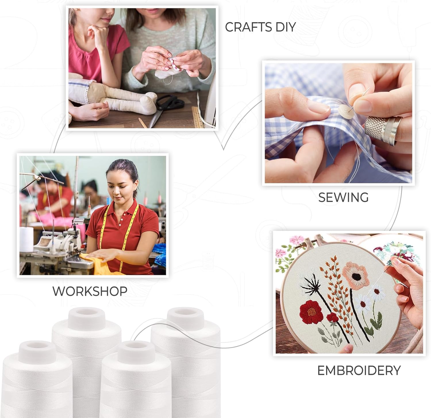 - Compatible with Most Sewing Sergers & Overlock Machines: Our all purpose white sewing thread can be used on most brands of sewing machines such as Brother, Babylock, Janome, Singer, etc. White thread for sewing is also used for hand sewing crafts, perfect for sewing friends' practical items.