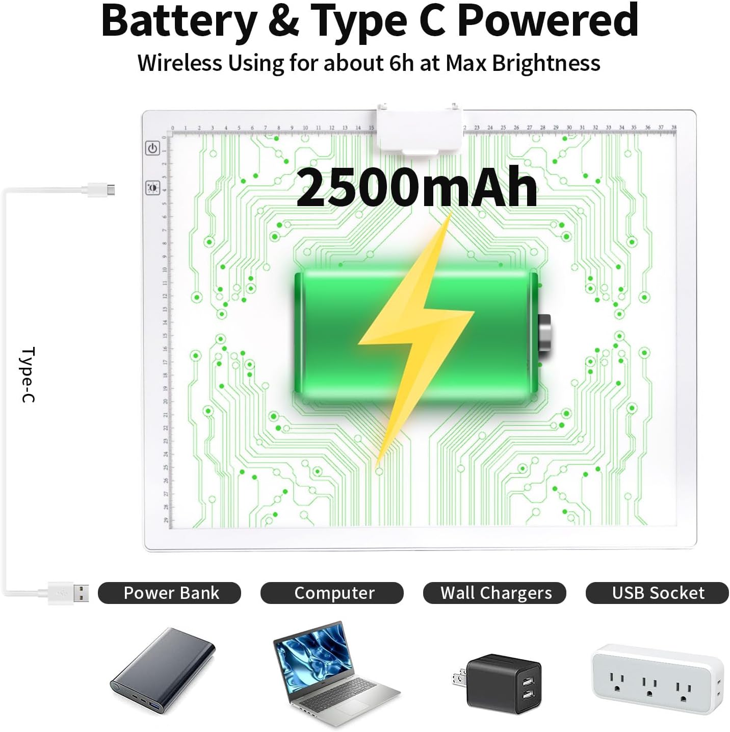 - [USB-C Powered and Battery Powered] The A3 rechargeable LED light pad contains a 2500mAh lithium battery, which can work for about 5 hours after 2 hours of charging, allowing you to enjoy the convenience of using it anytime, anywhere. We use an upgraded Type-C port that is more sturdy and stable to maintain stable charging. Comes with a 6-foot (1.8 m) cable that conveniently plugs into your laptop, power bank, USB adapter, and more. Applicable to both battery mode and charging mode.
