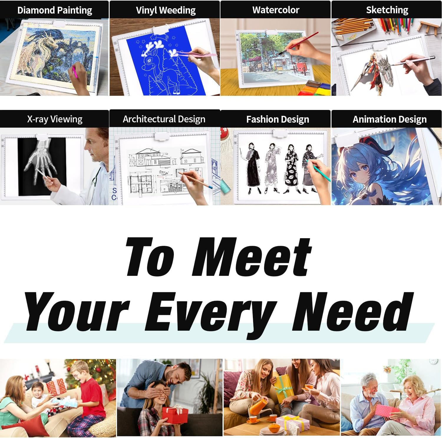 - ăWidely Used & Best GiftăA3 tracing board is large enough,measures 16.73 "x 13.5 "(42.5cm x 34.3cm), with a visible working area of 15.35 "x 11.89 "(39cm x 30.2cm).thin and easy to carry. Suitable for diamond painting,weeding vinyl.It's also great for sketching and painting, stenciling, 2D animation, calligraphy, embossing, scrapbooking, tattoo transfers,streaming, sewing projects, stained glass, quilting,and more.Best gift for Christmas, birthday or other holidays.