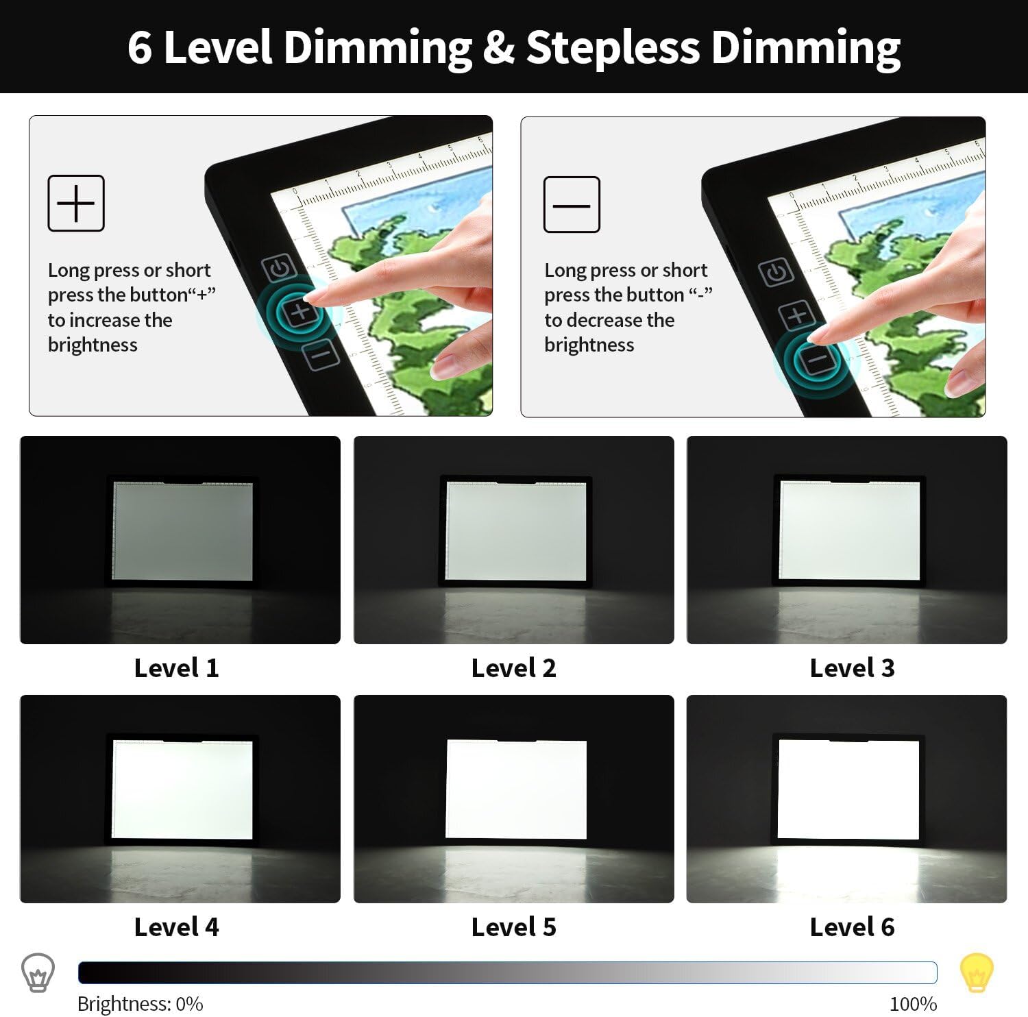 - 【6 Levels Dimming & Stepless Dimming】Tracing light box offers stepless and 6 levels adjustable brightness,By shortly press to choose 6 levels brightness or by long press to stepless dimming.allowing you to choose the perfect lighting for your artwork or diamond art.with 3000-6500K color temperature for even illumination without glare. Perfect for tracing and drawing without eye strain.