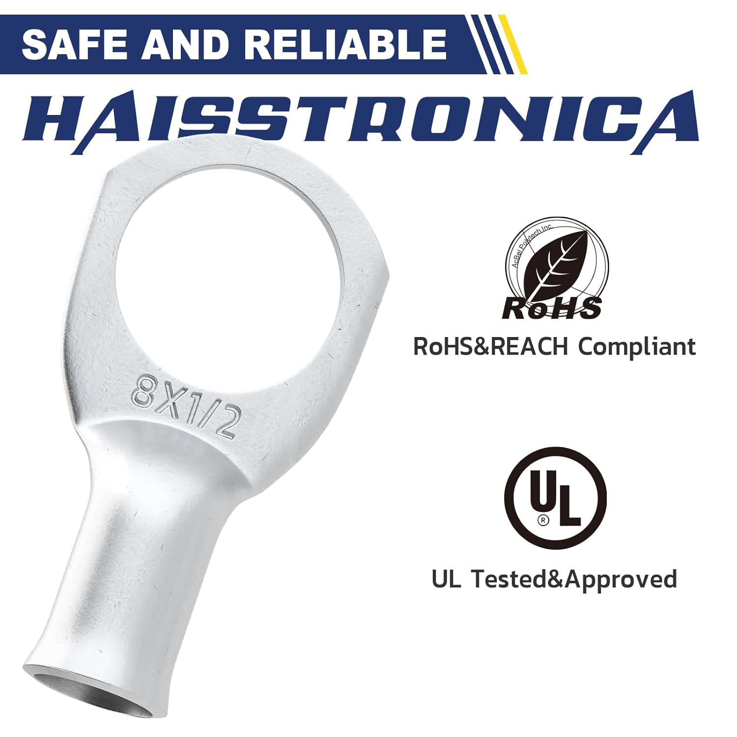 - High Quality Material: Our 8 awg ring terminals are adopted for bare annealed copper material with a special treatment surface for Corrosion & Oxidation Resistance. The 99.99% heavy duty pure copper lugs get a good transfer of electric in battery and achieve maximum current flow, effectively preventing short circuits and poor contact. 3:1 ratio heat shrink tube made of polyolefin material, which is non-toxic, temperature up to 257Β°F and flame-retardant, ensuring secure use and adherent