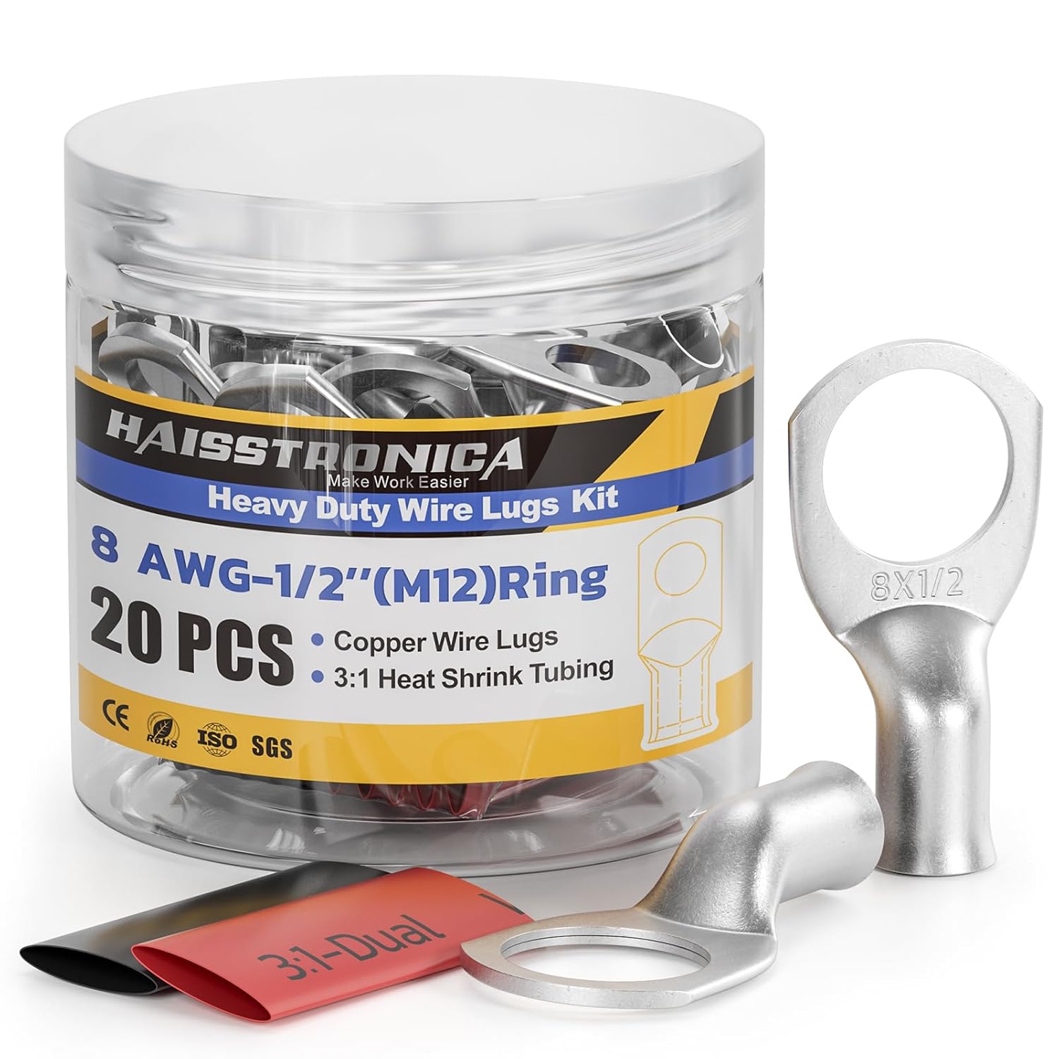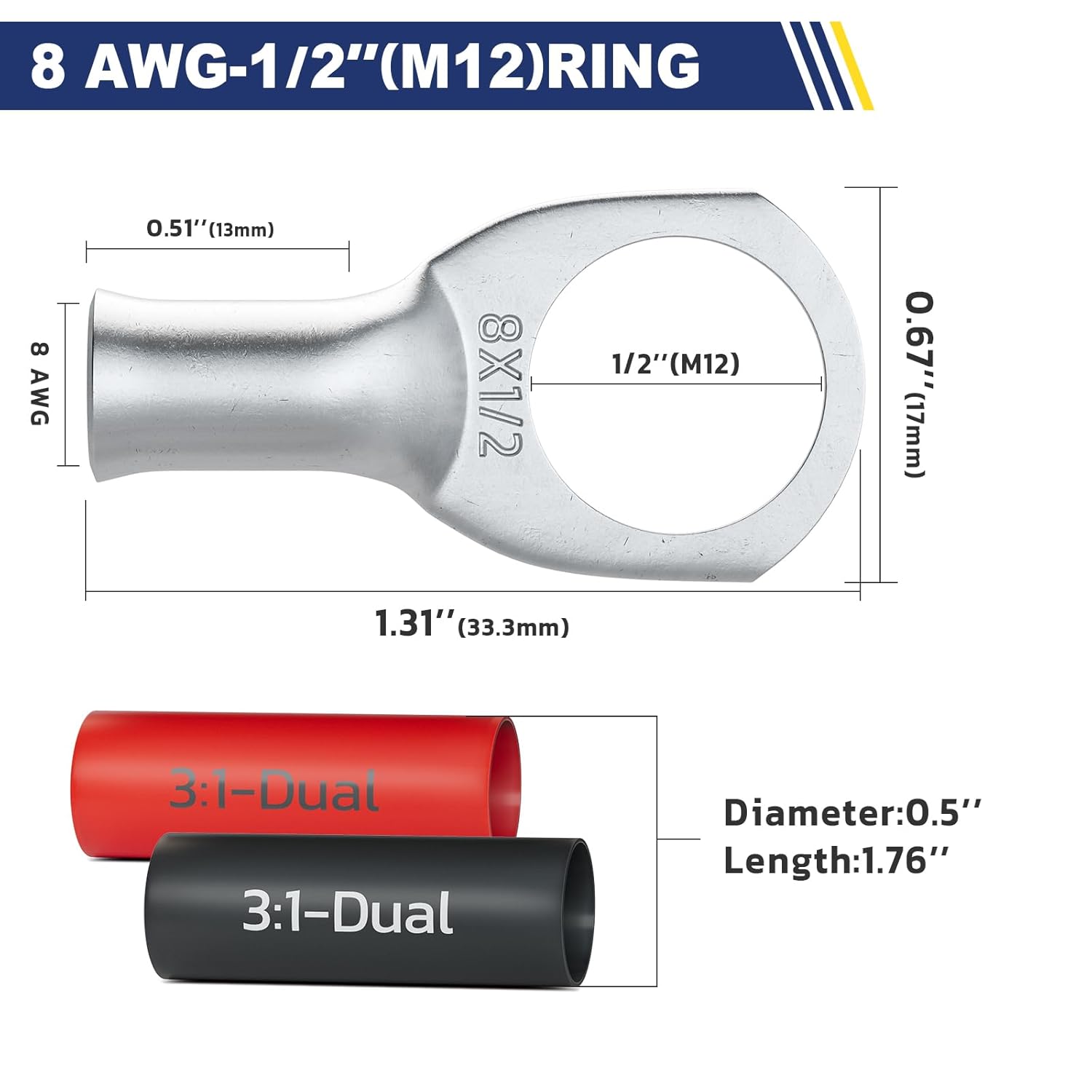 - Tinned Copper Lugs and Heat Shrink Tubing Kit: 10 PCS 8 gauge (AWG) -1/2" (M12)ring terminals tinned copper wire lugs and 10 PCS 3:1 Dual Wall Adhesive Heat Shrink Tubing(5 black and 5 red), and comes with a sturdy clear plastic jar that make battery cable ends easy storage