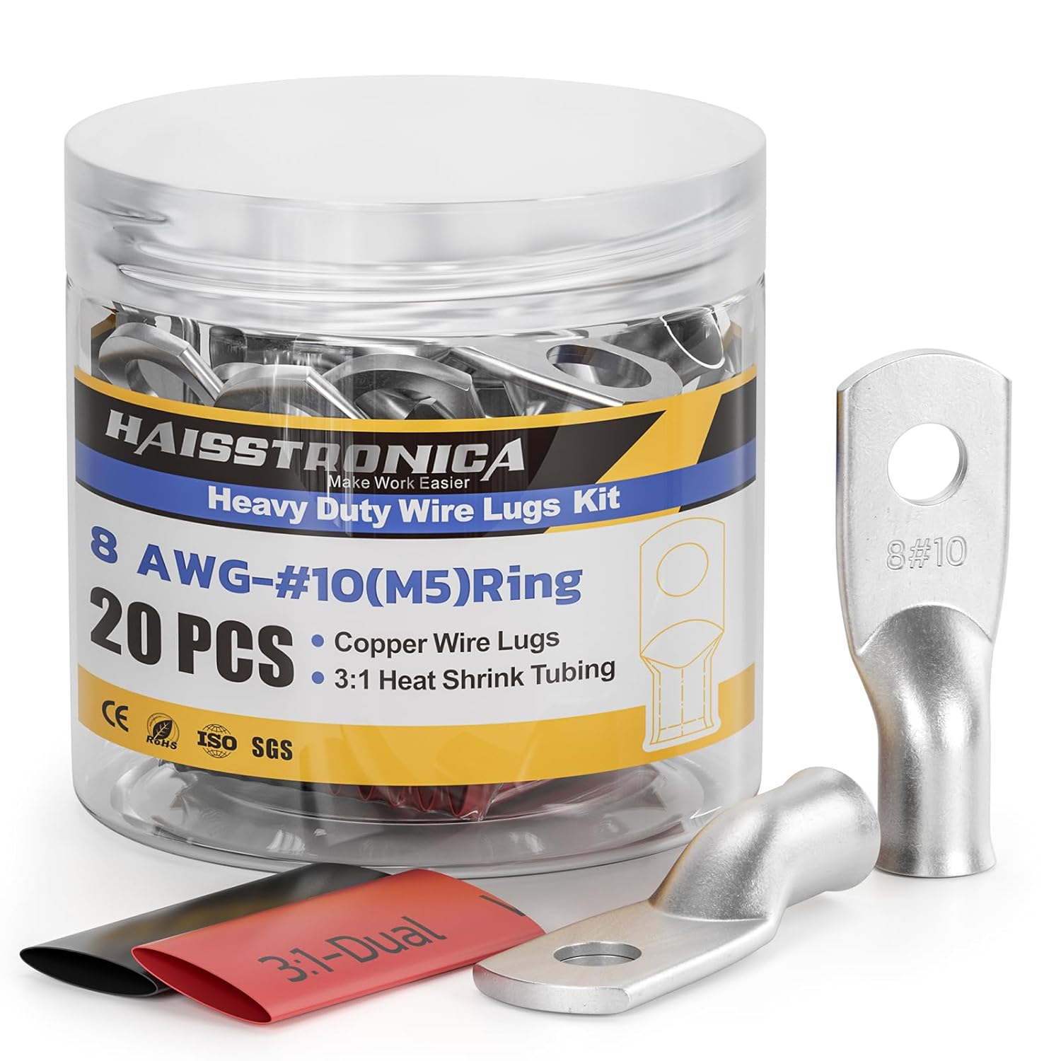 - Tinned Copper Lugs and Heat Shrink Tubing Kit: 10 PCS 8 gauge (AWG) - #10 ring terminals tinned copper wire lugs and 10 PCS 3:1 Dual Wall Adhesive Heat Shrink Tubing(5 black and 5 red), and comes with a sturdy clear plastic jar that make battery cable ends easy storage