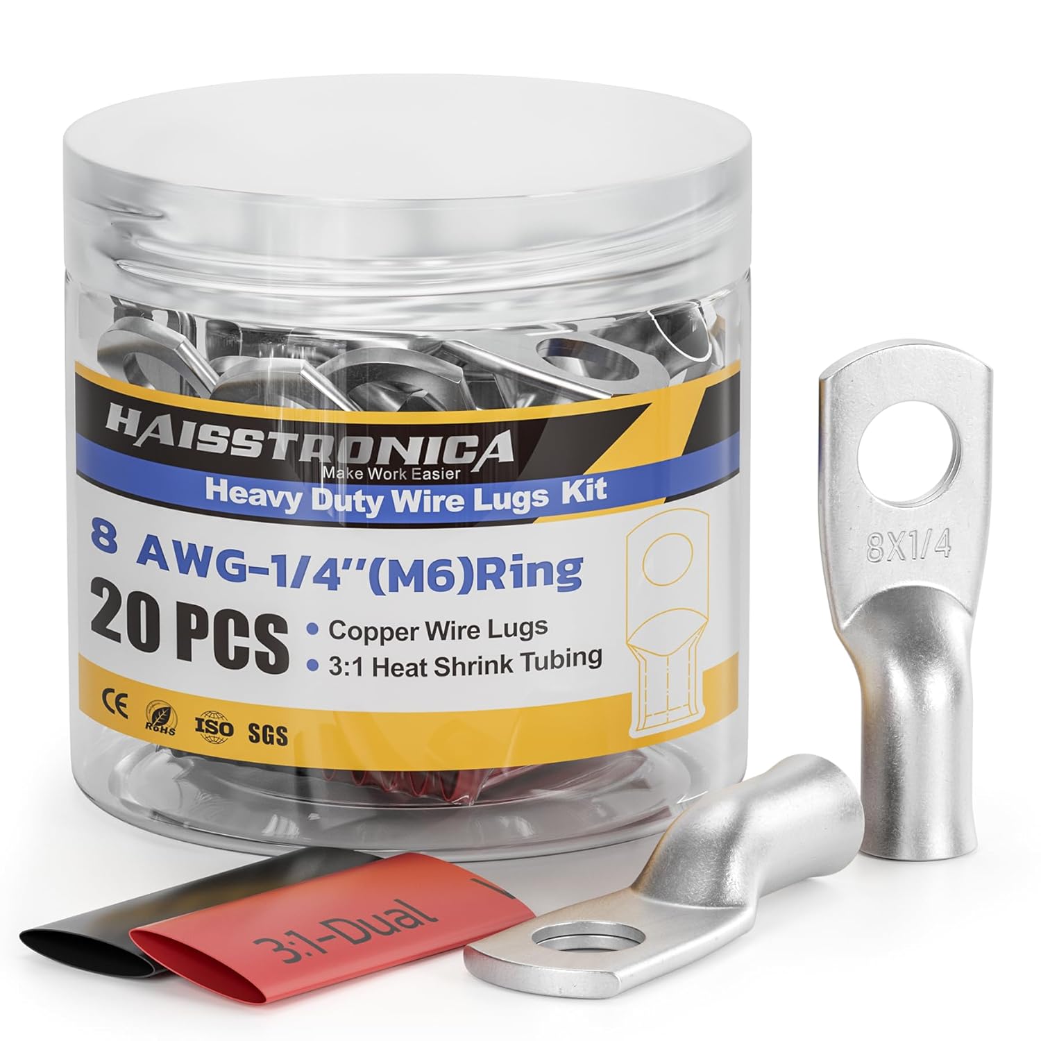 - Tinned Copper Lugs and Heat Shrink Tubing Kit: 10 PCS 8 gauge (AWG) - 1/4" (M6)ring terminals tinned copper wire lugs and 10 PCS 3:1 Dual Wall Adhesive Heat Shrink Tubing(5 black and 5 red), and comes with a sturdy clear plastic jar that make battery cable ends easy storage