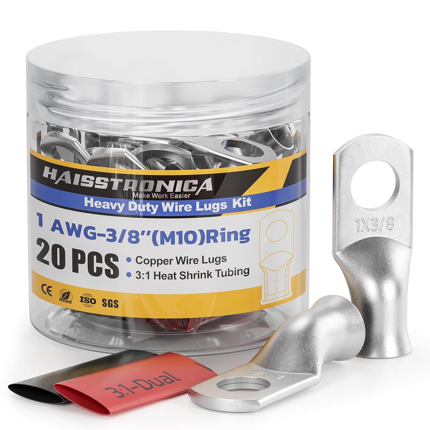 - Tinned Copper Lugs and Heat Shrink Tubing Kit: 10 PCS 1 gauge (AWG) - 3/8" (M10)ring terminals tinned copper wire lugs and 10 PCS 3:1 Dual Wall Adhesive Heat Shrink Tubing(5 black and 5 red), and comes with a sturdy clear plastic jar that make battery cable ends easy storage