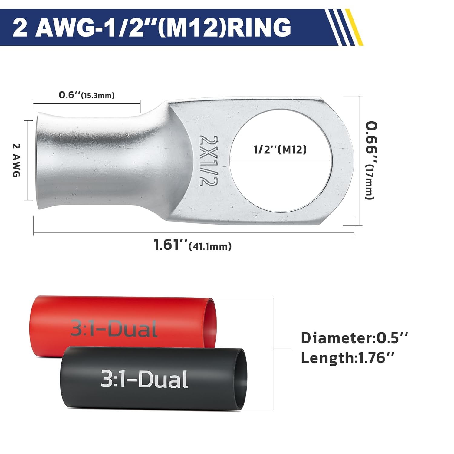 - Tinned Copper Lugs and Heat Shrink Tubing Kit: 10 PCS 2 gauge (AWG) -1/2" (M12)ring terminals tinned copper wire lugs and 10 PCS 3:1 Dual Wall Adhesive Heat Shrink Tubing(5 black and 5 red), and comes with a sturdy clear plastic jar that make battery cable ends easy storage